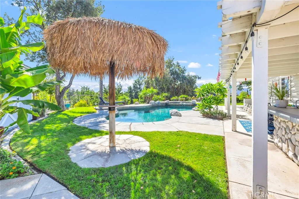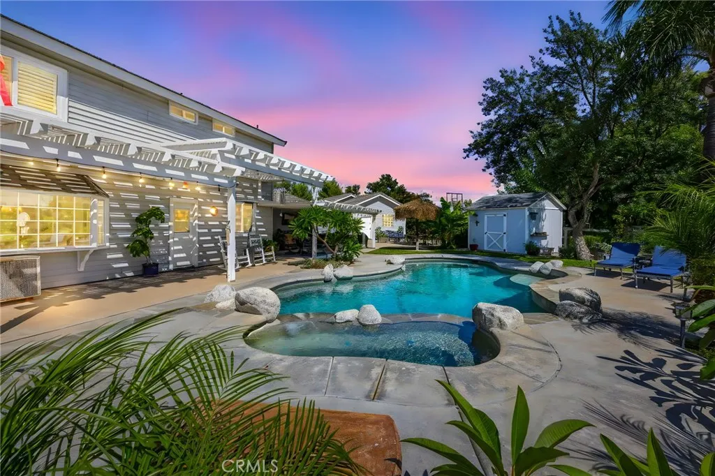 Welcome to your new sanctuary, perfectly nestled on a sprawling 22,651 sq ft corner lot in the coveted Meadowview community of Temecula! This stunning 3-bedroom, 2.5-bathroom home boasts an expansive 1,864 sq ft of luxurious living space, complemented by two bonus rooms and a dedicated laundry/storage room, adding approximately 500 sq ft of versatility to your lifestyle. As you arrive, be enchanted by the majestic Southern Live Oak gracing your yard, complete with a whimsical swing that sets the tone for relaxation and comfort. Step into your private backyard oasis, where resort-style living comes to life! Dive into the sparkling pebble tech pool and unwind in the luxurious spa. Host unforgettable summer barbecues at the built-in BBQ, shoot hoops on your own basketball court, and soak in the breathtaking 270 mountain views that unfold before you. Inside, modern sophistication meets cozy warmth. The main level features stylish LVP flooring and elegant plantation shutters throughout, illuminated by recessed LED lighting. The heart of the homethe beautifully remodeled kitchenexudes charm with a chic subway tile backsplash, timeless white shaker cabinets, and a farmhouse sink. Equipped with gleaming quartz countertops and top-of-the-line stainless steel appliances, including a wine cooler, this kitchen is a haven for culinary enthusiasts. It flows seamlessly into the family room, where a stunning split-face stone veneer fireplace creates the perfect ambiance for gatherings and relaxation. Upstairs, the primary suite and two additional bedrooms feature plush carpet, abundant nat