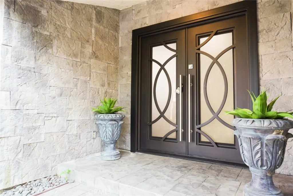 Welcome to a rare entertainer's retreat tucked behind a 100+ foot private driveway with gated entry. This Walnut Acres-area estate offers exceptional privacy and luxury on approximately 0.42 acres of lush, landscaped grounds. With recently completed major upgrades, this residence features 7,602 sq of refined living space, with 6 bedrooms and 6 bathrooms. A dramatic formal foyer introduces soaring ceilings, natural light, and a sweeping curved staircase. The formal living room features a fireplace and expansive windows, flowing seamlessly into the family room. The family room is complete with a full bar, second fireplace, and sliding access to the pool and outdoor living space. The gourmet kitchen boasts travertine and granite surfaces, abundant natural light, a spacious eat-in area, breakfast bar, and convenient pool access. An adjacent dining room opens to a private patio- perfect for alfresco entertaining. On the main level you'll find two bedrooms, from which one is en-suite, a powder room, and a versatile fitness room near the kitchen/laundry wing. Cascading curved staircase to the second floor with an ornate chandelier. A luxurious master suite (~1,000 sq ft) with private balcony overlooking the pool. sitting area, office nook, fireplace, dual walk-in closets, oversized bath with Roman tub, walk in shower, and dual vanities. Additional bedrooms, each with private bathrooms. A sprawling media/game room over (~700 sq ft), a soundproof recording studio ( a highlight for music lovers). And an office/guesthouse with its own private entrance. This prized location places you