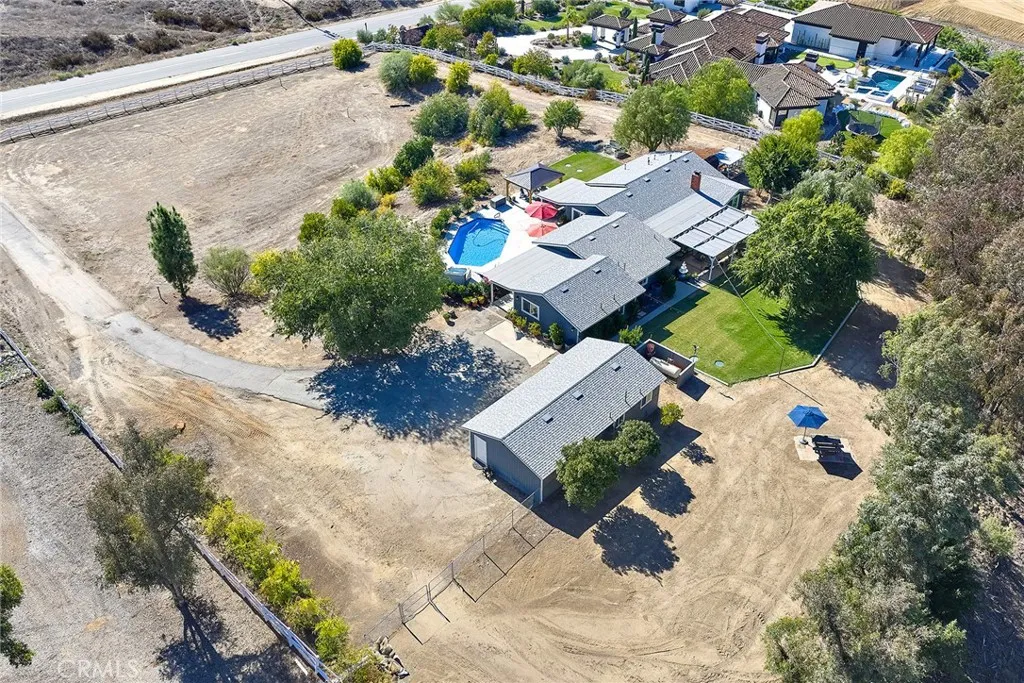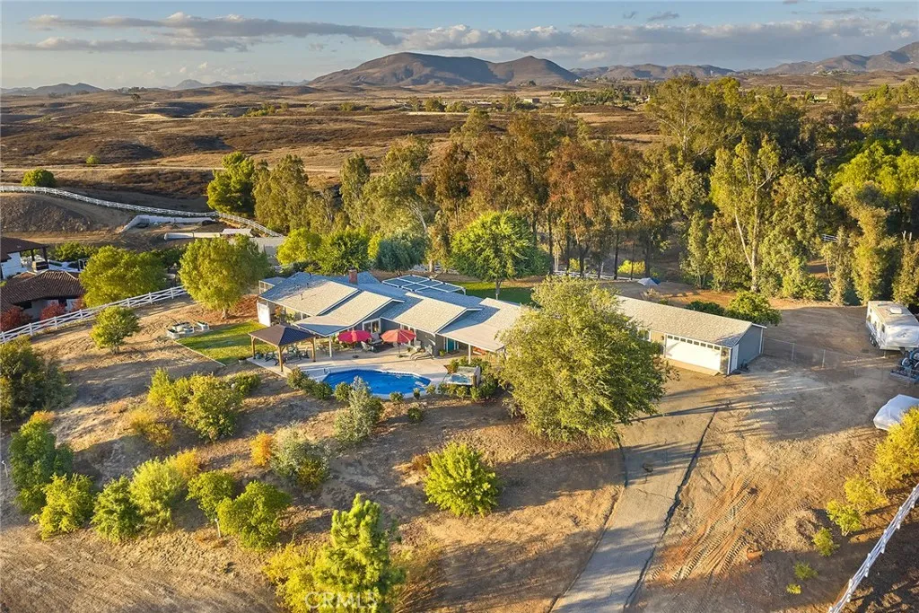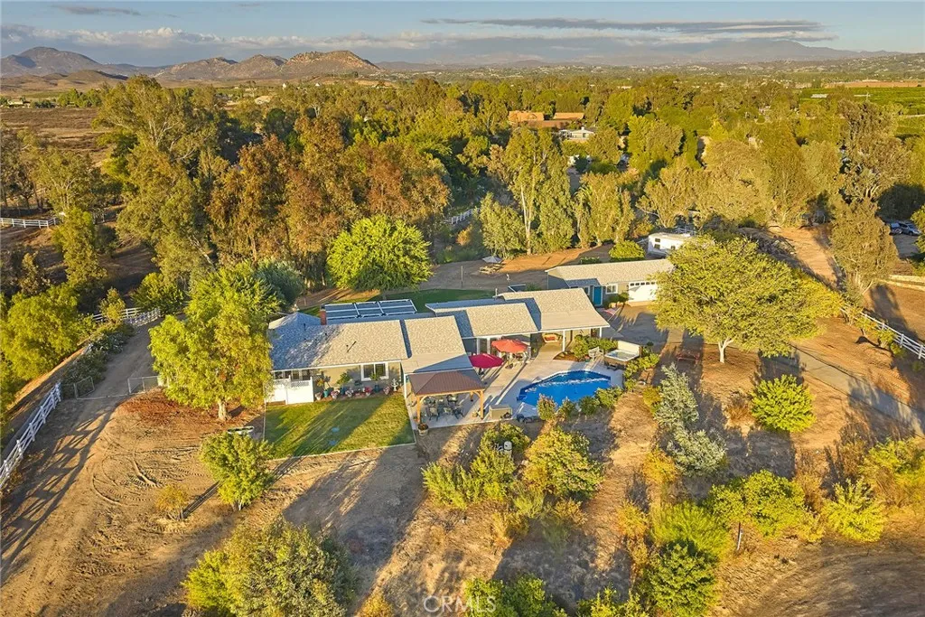 Discover your private sanctuary in the heart of Temecula Wine Country, just steps from Lorimar Winery. Set on 2.19 beautifully landscaped acres, this estate perfectly blends privacy, comfort, and the timeless charm of Wine Country living. Located within the desirable C/V (Citrus/Vineyard) zoning, the property offers ideal potential for an equestrian facility, private vineyard, or agricultural estate. This single-level residence features 4 bedrooms and 4 bathrooms across 2,299 sq. ft. of thoughtfully designed living space, seamlessly connecting indoor and outdoor areas. Inside, double-pane windows flood the home with natural light, showcasing formal living and dining rooms, a cozy family room with an upgraded fireplace, and a kitchen with updated cabinetry, premium appliances, and a bay-window breakfast nook. The primary suite boasts a spa-inspired bath with a dual-person shower and refined finishes, while a detached casita provides versatility for guests, extended stays, or a private office. Recent upgrades include a new roof, new central A/C, and an energy-efficient tankless water heater. Outdoors, enjoy a sparkling pool, above-ground hot tub, and multiple covered patios ideal for entertaining. The grounds are enhanced by new Bermuda sod, mature shade trees, Chinese elms, and fruit-bearing pomegranate trees, with multiple seating areas for gatherings or quiet relaxation. With approximately 18,000 sq. ft. of flat, usable land, this property offers endless opportunities for vineyards, orchards, or equestrian pursuitsall in one of Temeculas most sought-after Wine Country loca