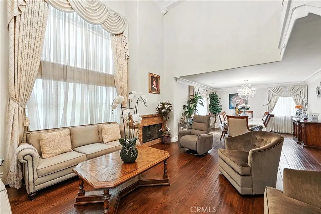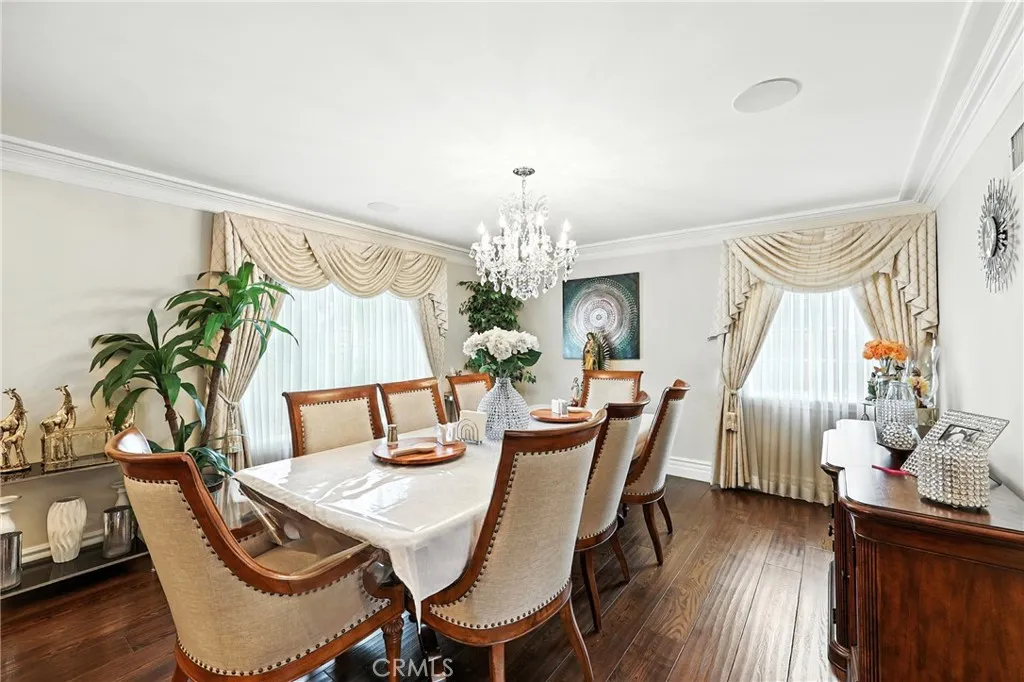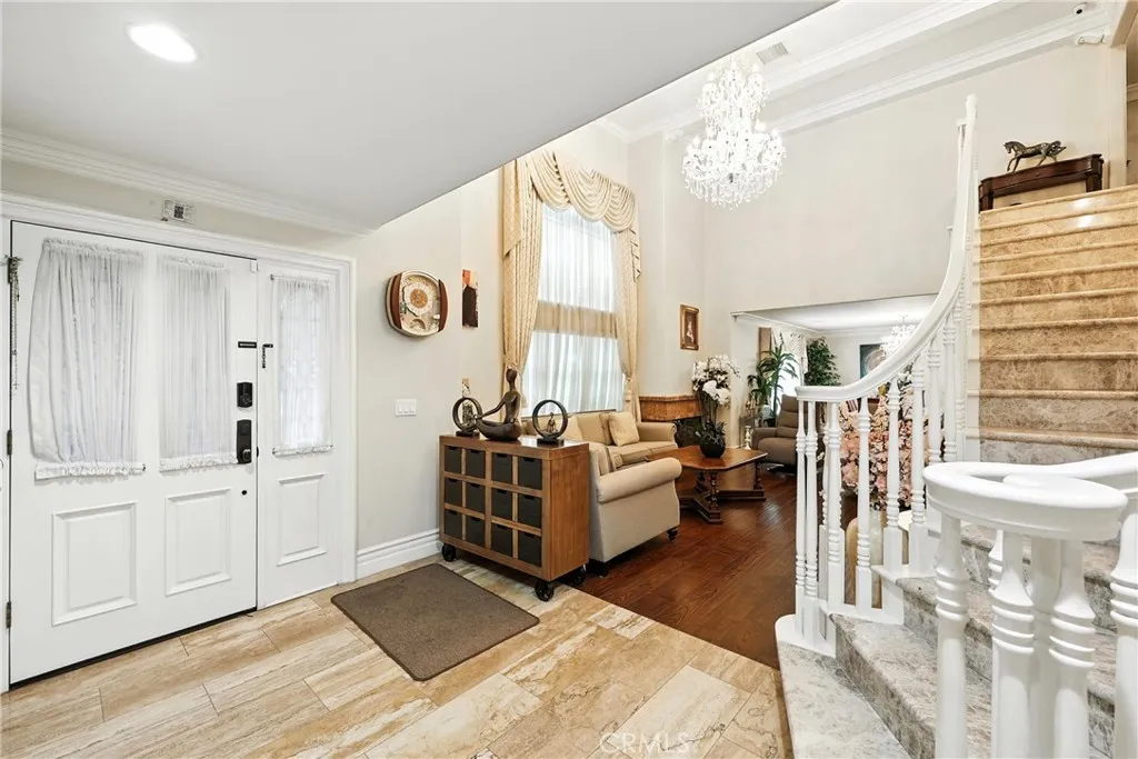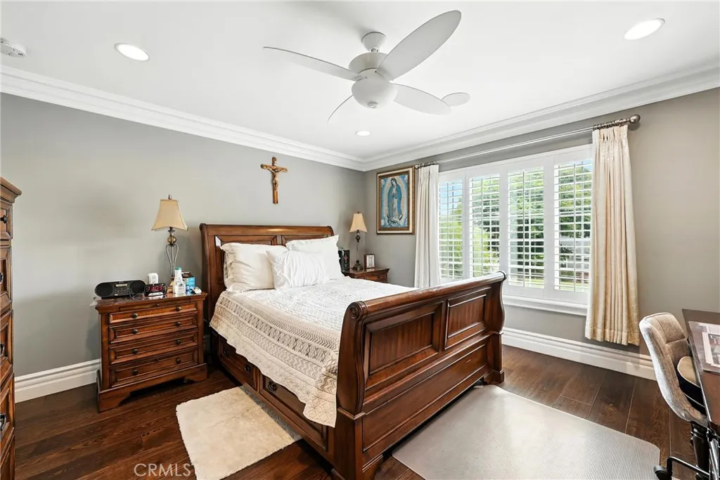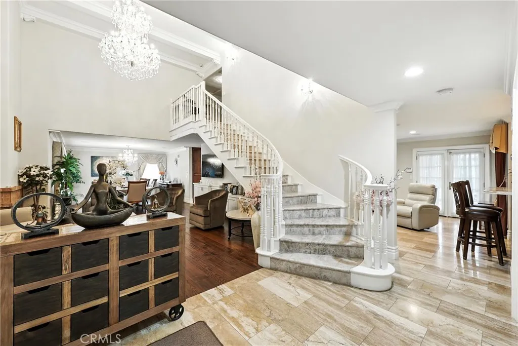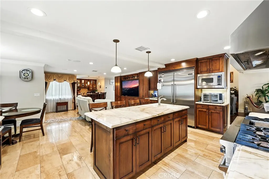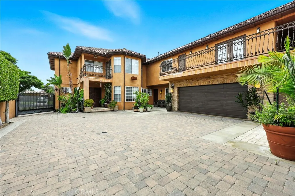 No details have been spared on this 3,922 SqFT home with a large 8,128 SqFt lot! This stunning and sprawling 2 story home greets you with a formal entryway featuring a curved staircase, chandelier, and a vaulted ceiling that flows to the living room with a cozy fireplace and a dining area one direction then to a family room with a wet bar and an entertainers kitchen the other direction. The entertainers kitchen is masterfully designed with an island, walk-in pantry, professional-grade stainless steel appliances, and an elegant breakfast nook. The first floor is abundant with natural lighting filtering through the expansive windows and also conveniently offers 1 common bathroom plus a secluded 1 bedroom with an attached bathroom and laundry room with a private hallway perfect for guests or multi-generational living! Upstairs leads to a tastefully decorated landing with custom niches and luxe lighting that leads to the hallway where the remaining 4 bedrooms and 4 bathrooms are located. The oversized primary suite offers a walk in closet, attached bathroom with a vanity area and soaking tub, attached office, and a private balcony with tile flooring and wrought iron railings. The 3 remaining bedrooms each have their own bathroom and 2 of those bedrooms also have their own walk-in closet; everyone is sure to enjoy their own private space. The home offers an attached 2-car garage as well as a detached 2-car garage accented by pavers along the driveway and to the backyard where there is a covered outdoor kitchen. Boasting with curb appeal and exuding elegance, this luxurious North