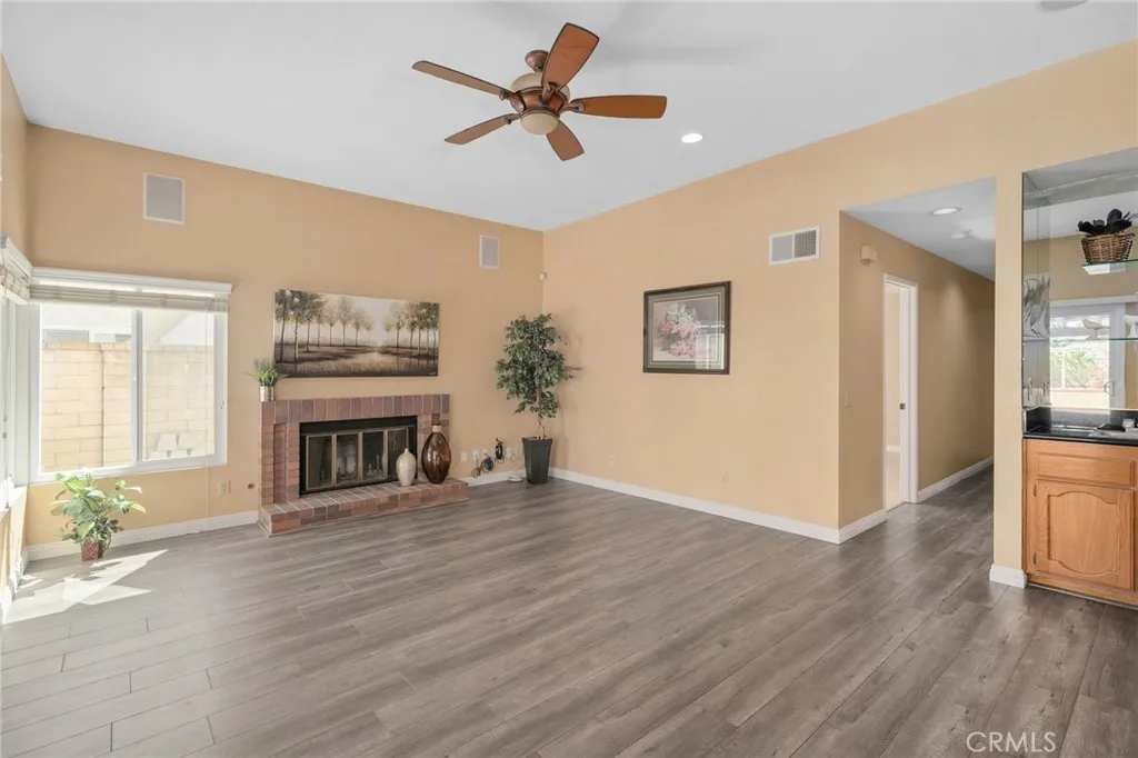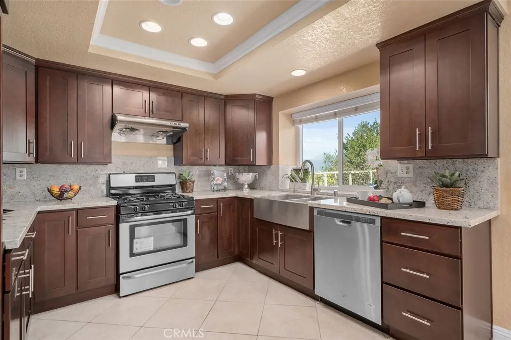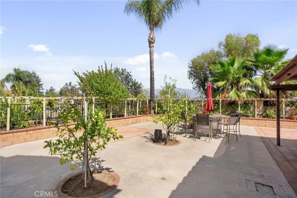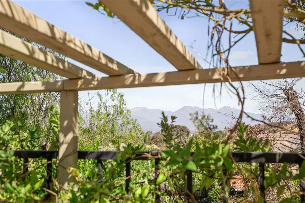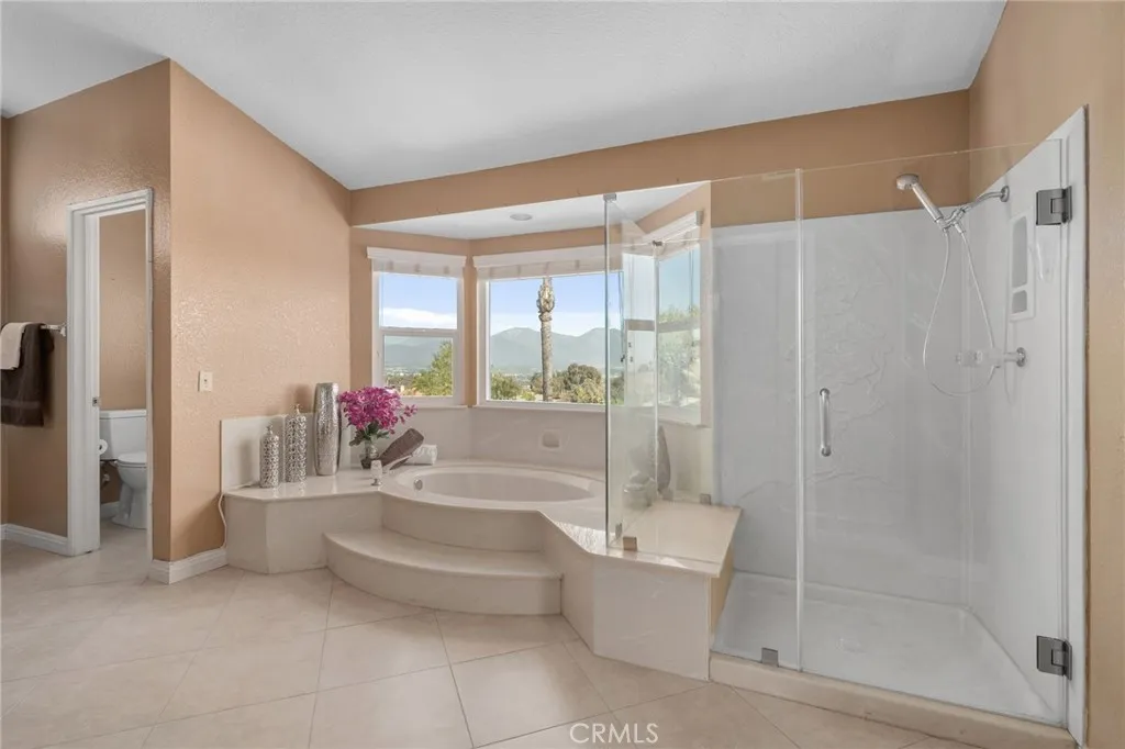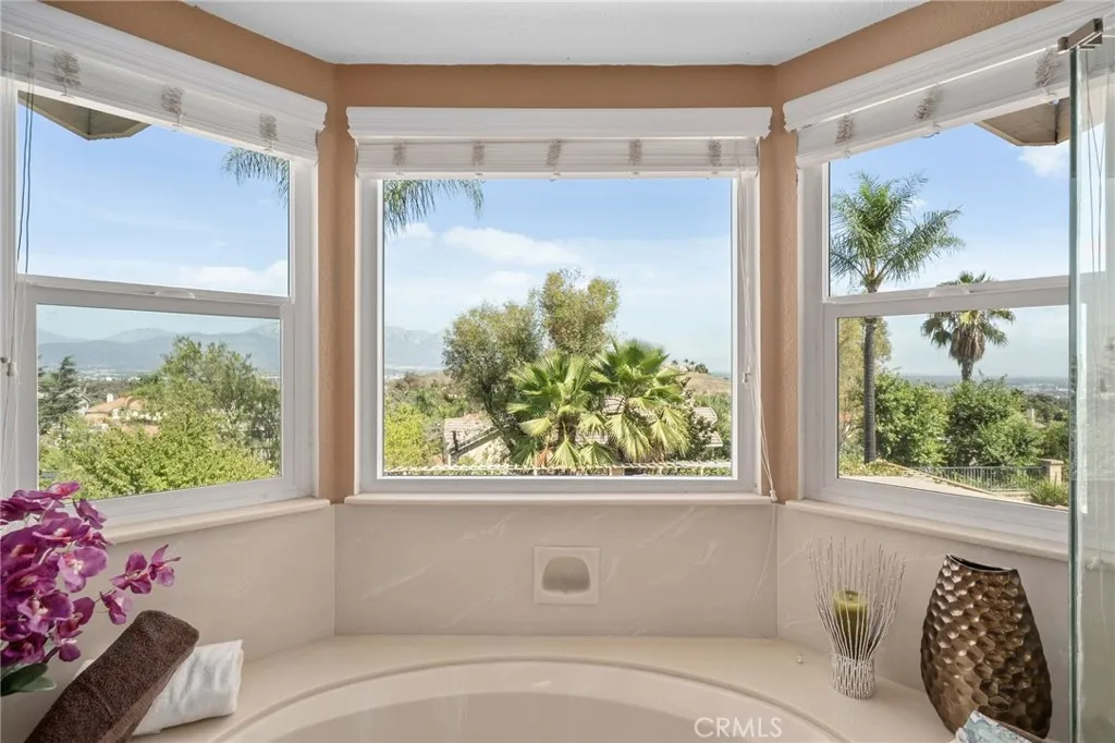 Experience the quintessential Chino Hills lifestyle on the highly sought-after North Side. This Elegant Mediterranean Corner Lot residence commands attention upon arrival, boasting beautiful curb appeal, mature landscaping, a private brick-edged front patio, a lush grass area, and a generous 3-car garage. For security, property features two side access gates from the front yard. Step through the front door into a soaring, two-story formal entry, where dramatic vaulted ceilings and vast windows flood the space with light. The main level flows seamlessly across tiled and modern wood-look flooring, guiding you past the formal living and dining rooms. The formal dining room, illuminated by a statement chandelier and featuring a large built-in mirror, sets a tone of grandeur. The well-appointed kitchen features rich cabinetry, sparkling granite countertops, and Stainless Steel appliances. It serves a charming light-filled breakfast nook with a bay window. Adjacent is the family room, perfect for relaxing evenings, complete with a cozy brick fireplace and dedicated built-in wet bar. Flexibility is key, with a crucial generously sized downstairs bedroom and dedicated 3/4 bath with a shower, ideal for guests or a private office. Ascend to discover the luxurious Primary Suite, a true sanctuary. This expansive room, complete with a walk-in closet and ceiling fan, boasts multiple window sets that capture the sweeping, panoramic mountain and city light views from every angle. The private bath features a large soaking tub set into a bay window. Three generously sized secondary bedrooms