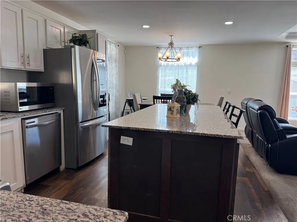 This home is located 22 minutes from the new Hard Rock Casino, 20 minutes from Tejon Pass, 35 minutes of both Bakersfield and Valencia (Santa Clarita Valley), and it's move-in ready! This spacious double-wide Champion Home is located in the well-maintained Oakridge Mobile Home Park with no neighbor on one side, per park management. Featuring 3 rooms (2 bedrooms and 1 office with barn doors (currently used as a bedroom), 2 bathrooms, and this home offers comfort and functionality. The open kitchen includes a large island, granite countertops, stainless steel appliances, and many updates: new gas stove and hood vent, new faucet, new bathroom sinks, freshly painted interior, and central heat and air conditioning with a new digital thermostat. Other highlights include coffered ceiling in living room, vinyl plank flooring, recessed lighting with dimmers, security door and alarm system, slow-closing toilet seats, and a dedicated laundry room. Enjoy outdoor living on the aluminum wood-covered deck and private backyard, plus a full-length awning covered carport for up to three vehicles.