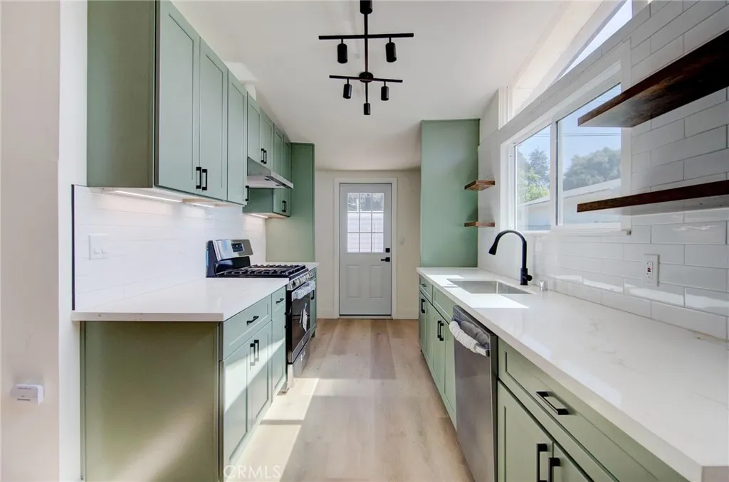 Fantastic purchase opportunity on this completely remodeled, turnkey, move-in condition 3 br 2 ba home with huge backyard for limitless possibilities. Recent upgrades include new composition roof, fresh interior and exterior painting, new texture on interior walls, new overhead garage door with glass inserts, new R30 and R15 insulation for the roof and exterior walls, 8 mm 9" luxury vinyl flooring throughout the house, upgraded 5 1/2" floor mouldings, 2 1/2" window, door and closet mouldings, gorgeous kitchen with who/gold quartz countertops, vibrant and classic mint colored shaker solid wood cabinets and black cabinet pulls, matte porcelain subway tile backsplash and solid wood american oak shelves, sound damping solid wood accent walls, 8W 120V cabinet lighting, Samsung 5-burner Stainless Steel gas range & microwave, dishwasher, Moen disposal, large format porcelain tiles and porcelain mosaics in the bathrooms, market tile bathroom flooring, porcelain tile and marble tile in shower walls, 32" vanities & tempered glass shower doors in both bathrooms, humidity sensing exhaust fans, new dual pane windows throughout, new interior and exterior doors, new closet doors, French doors in both bedrooms, 4 Mitsubishi mini split AC units, new 200 AMP electrical panel, new breaker for all wirings, GFCI's, new pendant light fixtures, recessed lights and ceiling fans with lighting kit, new overhead garage door motor, plumbing updates with new sink faucents & shower sets, upgrade partial kitchen & shower water supply lines, new laundry utilities including cold/hot water, sewer, gas, and