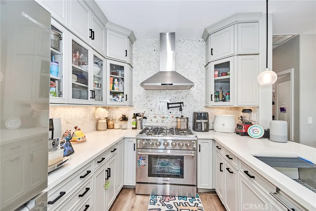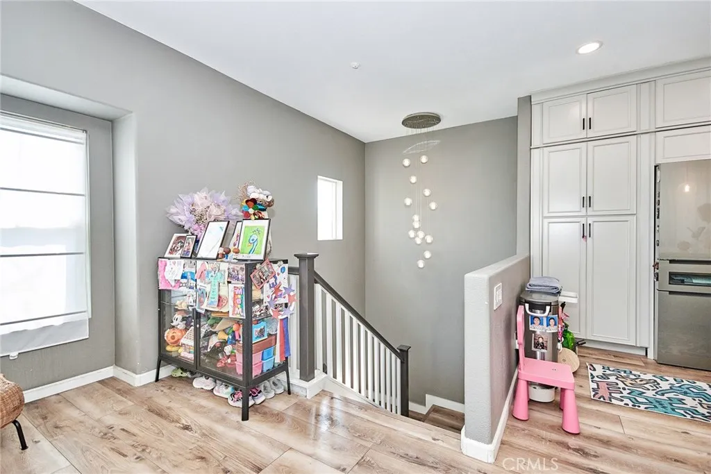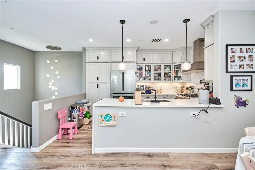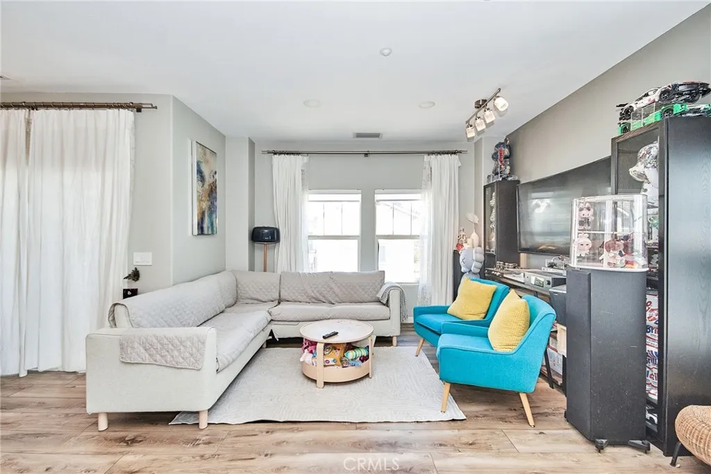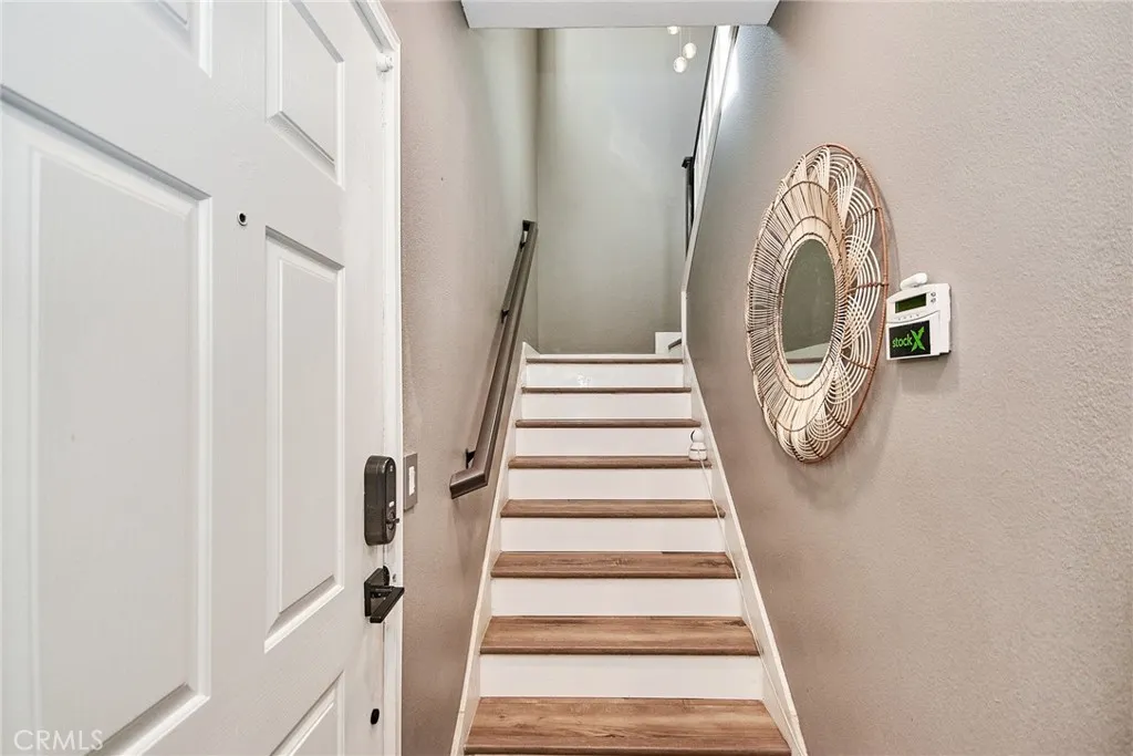 Discover the epitome of modern living in this exquisite corner unit within Rancho Cucamonga's prestigious Brighton at Etiwanda community. This thoughtfully upgraded 2-bedroom, 1-bath residence boasts an open-concept layout with soaring ceilings, where all living spaces are conveniently situated upstairs for enhanced privacy. The contemporary kitchen stands out with its self-closing cabinets, premium quartz countertops, stainless steel appliances, and generous pantryideal for everyday meals or hosting gatherings. Adjacent, the dining area features a chic light fixture and seamlessly connects to the living room, bathed in natural light from expansive windows. Step out from the living space or the master bedroom onto one of two private balconies, perfect for morning coffee or evening unwinding. The master suite offers a spacious walk-in closet, direct balcony access, and an en-suite bath with dual sinks, modern cabinetry, quartz vanity, and a walk-in shower. Throughout the home, durable wood-look waterproof luxury vinyl flooring adds a touch of elegance, complemented by a convenient indoor laundry area for full-sized appliances. Additional highlights include a large attached 2-car garage with direct access and extra storage, plus recent remodels in the kitchen and bath. Community perks abound with low HOA dues covering water, along with access to a resort-style pool, spa, outdoor showers, BBQ and picnic areas, and a playground. Ideally positioned just moments from Victoria Gardens for upscale shopping, dining, and entertainment, and with seamless connectivity to the 15, 210, a