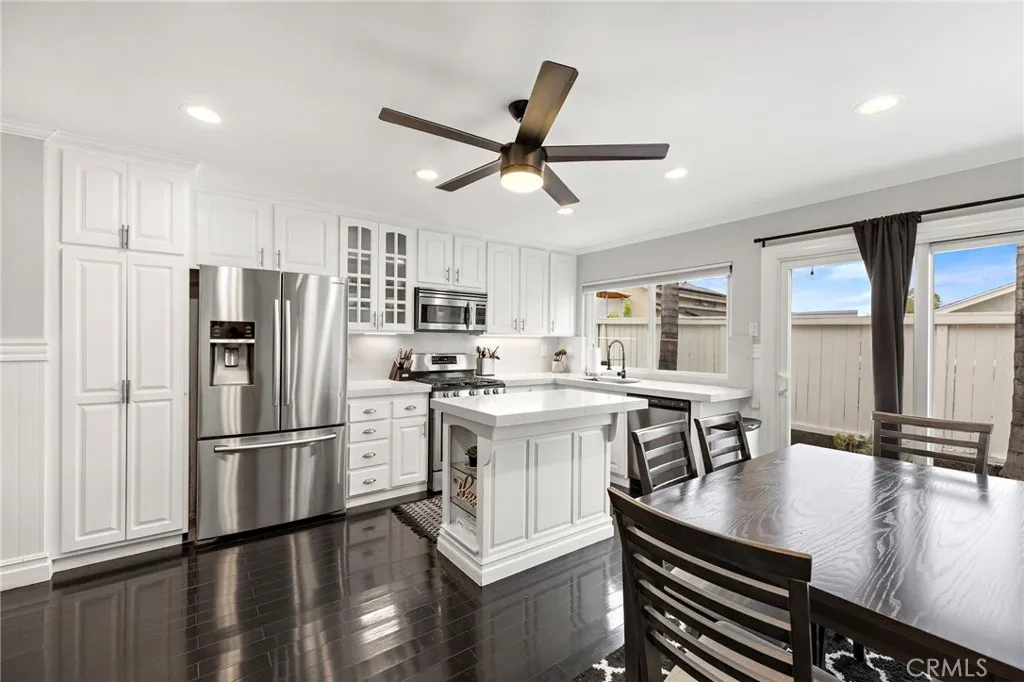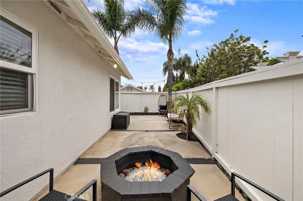 Ideally located on a peaceful side street cul-de-sac in the heart of Robinson Ranch surrounded by beautiful mountains, this updated single-level stunner is sure to impress! Upon arrival, high-pride-of-ownership is apparent with fresh improvements including newer exterior paint, light fixtures, and stylish landscaping. A white picket fence frames in the low-maintenance and useful front turf yard - a great outdoor space! An entry Dutch door welcomes you inside the large living room with a cozy gas fireplace, ascending ceiling plate with overhead fan and wired surround sound. Recently painted inside, the light and bright interior contrasts the dark hardwood flooring throughout. Just off the living room, the updated kitchen offers stainless appliances (newer range), new quartz counter tops, a new sink and faucet, a centered island, formal dining, clever bar-top seating, wainscoting, and ample Eastern-seaboard-style cabinetry for abundant storage. Large picture windows let natural light into the space and glass slider doors access the rear and side patios with an in-line gas fire pit. Very private outside and rare to come by! The family room and open kitchen create an inviting space for relaxing and entertaining. Beyond the living areas, three generous bedrooms (one currently a nursery, one used as an office with bay window and vaulted ceilings) and two nicely-remodeled bathrooms all provide comfortable, turn-key living. The primary offers his & hers mirrored closets, wainscoting, and spa-like bathroom with new vanity, dual sinks, fixtures, counter top, shower enclosure, tile, a