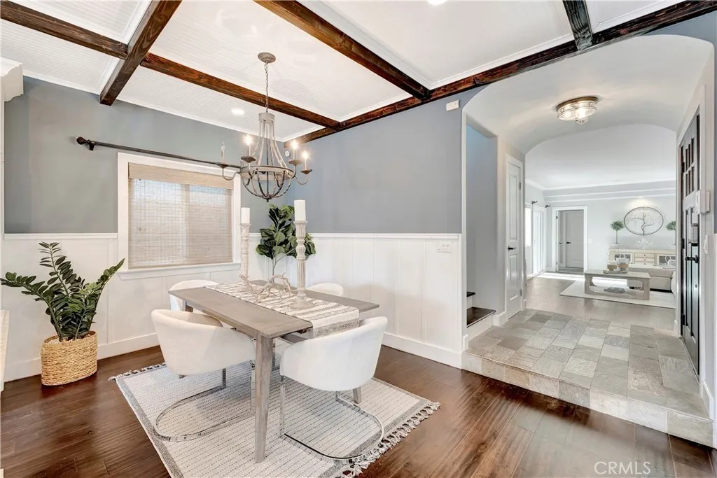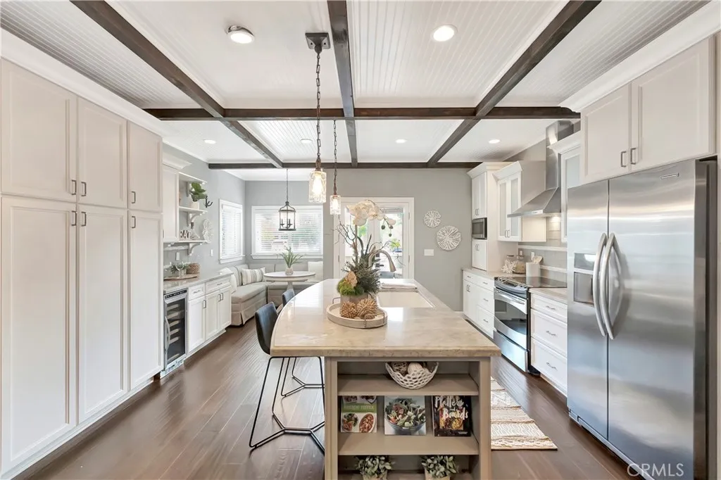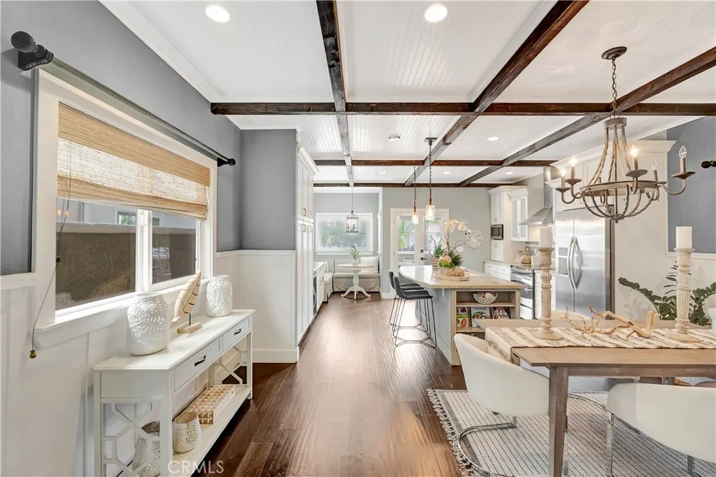 Just five blocks from the sand and a couple blocks from the heart of downtown, this exceptional Huntington Beach home embodies the essence of modern coastal living. Spanning approximately 2,700 square feet, it combines refined design, custom craftsmanship, and effortless livability in one beautifully curated package. Inside, natural light and elegant upgrades define the open-concept layout. The main level features a welcoming living room with a cozy fireplace and access to a private side yard, a half bath, and a convenient laundry room with sink that connects directly to the two-car garage. The chef-inspired kitchen is a true centerpiece, showcasing custom ceiling with wood beams, shaker cabinets, a spacious center island with bar seating, a built-in breakfast nook, and premium stainless steel appliances. The space flows easily into the formal dining area and out to a private front patio complete with a firepit, perfect for relaxed evenings and ocean breezes complete with a gas line to easily add a built-in BBQ center. Upstairs, the primary suite offers a tranquil escape with a double-sided fireplace, a generous walk-in closet, balcony, and a spa-caliber bathroom with dual vanities, a soaking tub, and a walk-in shower. Two additional bedrooms and bathrooms are thoughtfully positioned nearby, while a bonus room with soaring ceilings and a fireplace creates the perfect spot for a media room, lounge, or home office. A versatile loft on the upper level opens to the rooftop deck, where panoramic views set the stage for unforgettable entertaining or quiet sunset moments. With thr