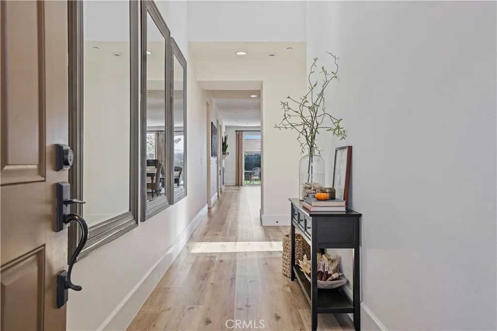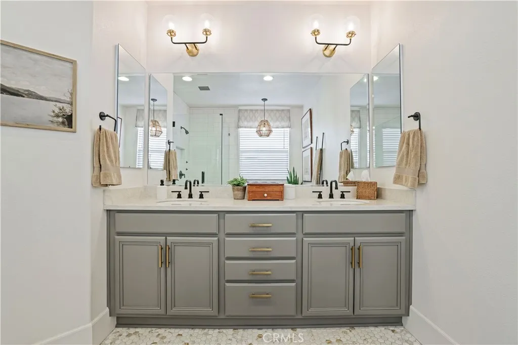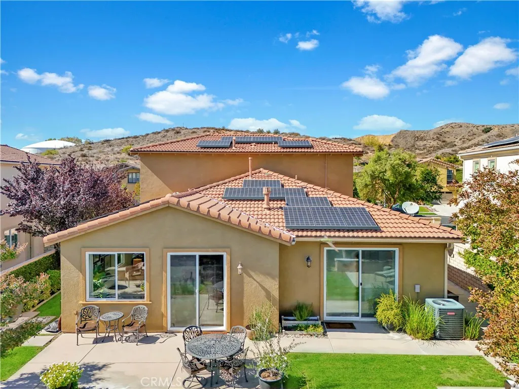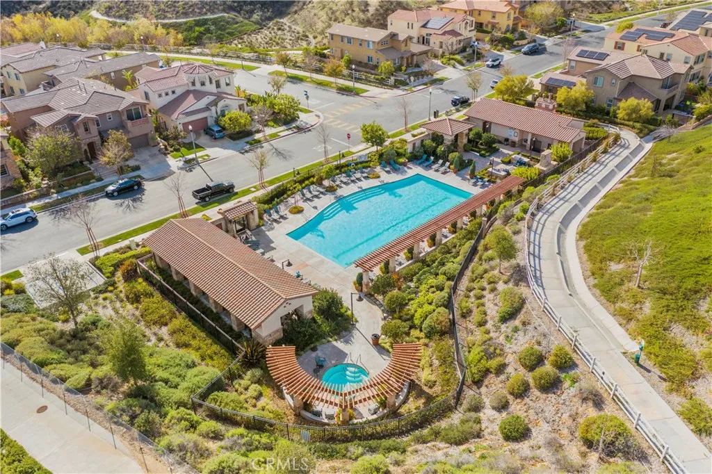 Welcome to West Hills-one of Valencia's most prestigious gated communities! This home offers a wonderful balance of elegance and comfort, featuring A MAIN FLOOR PRIMARY SUITE. The recently updated primary bathroom features a free-standing soaker tub and separate walk-in shower with decorative hexagon porcelain floor tiles. Also on the main level, there is a guest bedroom, bathroom, powder room and laundry room with sink. The open-concept layout creates a seamless flow between the kitchen, dining, and family room, creating an inviting space for everyday living and entertaining, including custom built-in cabinetry and shelving surrounding the fireplace. The stunning kitchen features a generous center island with seating, pendant lighting and gorgeous quartz countertops with tile backsplash. Additional kitchen upgrades include stainless steel appliances and a stainless steel farmhouse sink with designer faucet. On the second level, you'll find a spacious loft, 2 secondary bedrooms with walk-in closets and a full bathroom with a double vanity. This home includes ample storage with a large closet under the stairs and various cabinetry throughout. The flooring, baseboards, lighting, bathroom fixtures and hardware have been upgraded throughout the home. Enjoy California living in the recently upgraded backyard with lush greenery, multiple patio areas, seating walls, a fire pit, and ambiance lighting, as well as a Smart Control irrigation system. Another great feature is the Taexx In-Wall Pest Defense System. This home features a solar power system to help reduce energy costs. Such