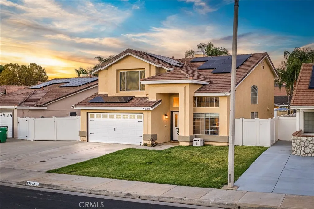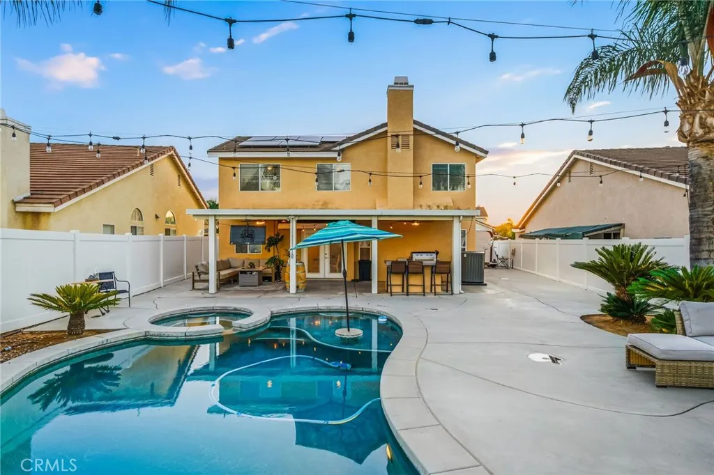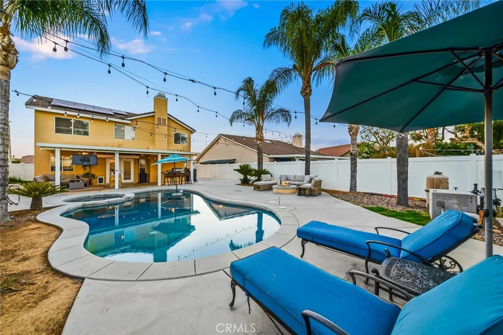 Welcome to your dream home in the heart of Menifee! This stunning turnkey property combines modern luxury with practical living. Boasting a spacious floor plan, this beautiful 2 story home offers 4 bedrooms and 2.5 bathrooms, providing ample space for family and guests. Step into the inviting living area where a cozy fireplace sets the perfect ambiance. The kitchen features sleek granite countertops and an abundance of cabinetry. The backyard oasis is complete with a sparkling pool, fire pit, and a covered patio which is perfect to entertain family and friends at the built in BBQ. You'll love the convenience of the RV parking alongside the 2 car garage which provides extra storage. This beautiful home features additional highlights including updated vinyl fencing around the whole property, updated vinyl plank flooring and new energy efficient solar panels. No HOA and low taxes! Nestled in a neighborhood close to shopping, dining, schools, and Temecula wineries. Don't miss this rare opportunity!