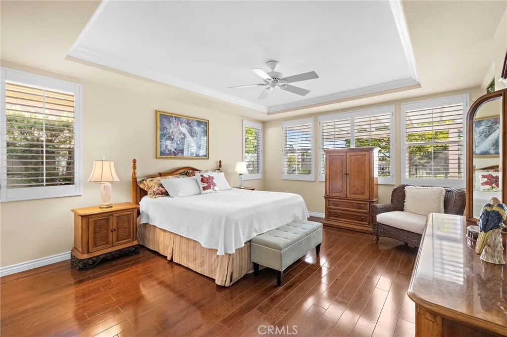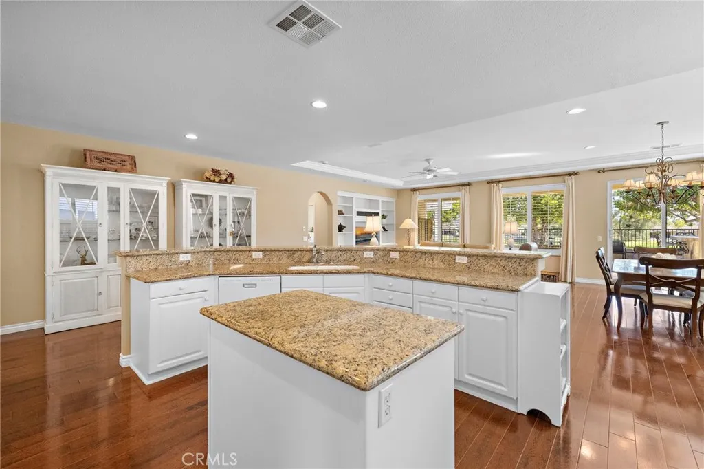 Panoramic GOLF VIEW!! Single Family Home- 3 Bedrooms with office. The Oasis is a vibrant 55+, 24-Hour Guard Gated and Resort Style Community and boasts the Menifee Lake Country Club Golf Course, along with many amenities. Step in this double door freshly painted exterior to the customized entry way with added dramatic arches, wood flooring and can lighting throughout. Custom Bookcase added in the stellar sized Family Room. Open concept with large gourmet kitchen, granite countertops, an extended bar, provides exceptional space and dining options. Formal dining is adjacent to kitchen and family room for optimal entertaining and view of golf course. Primary Bedroom has upgraded custom shelving and a retreat style area. Primary bath has been upgraded with porcelain tile flooring, raised counters and walk- in shower. Secondary Rooms are both spacious: one with wood flooring and one with carpet and shared bath with tub. The office space is a builder upgrade with above desk shelving added. Inside laundry and sink. Patio has built in BBQ plenty of space to relax and freshly painted fencing to enjoy the quiet of the golf course. HOA covers front yard care and trash service.