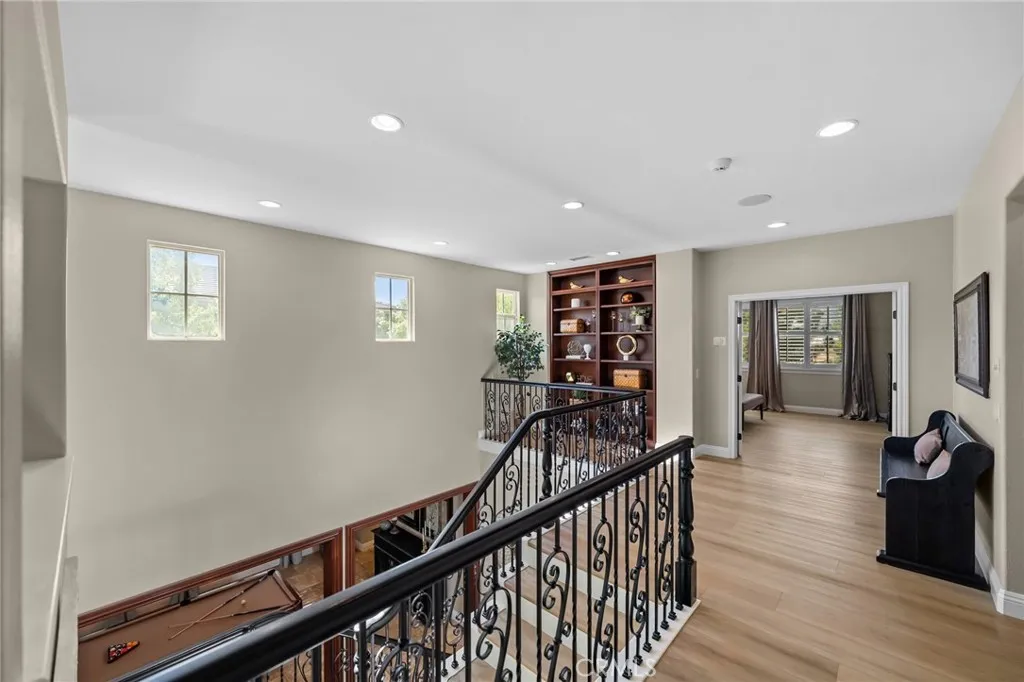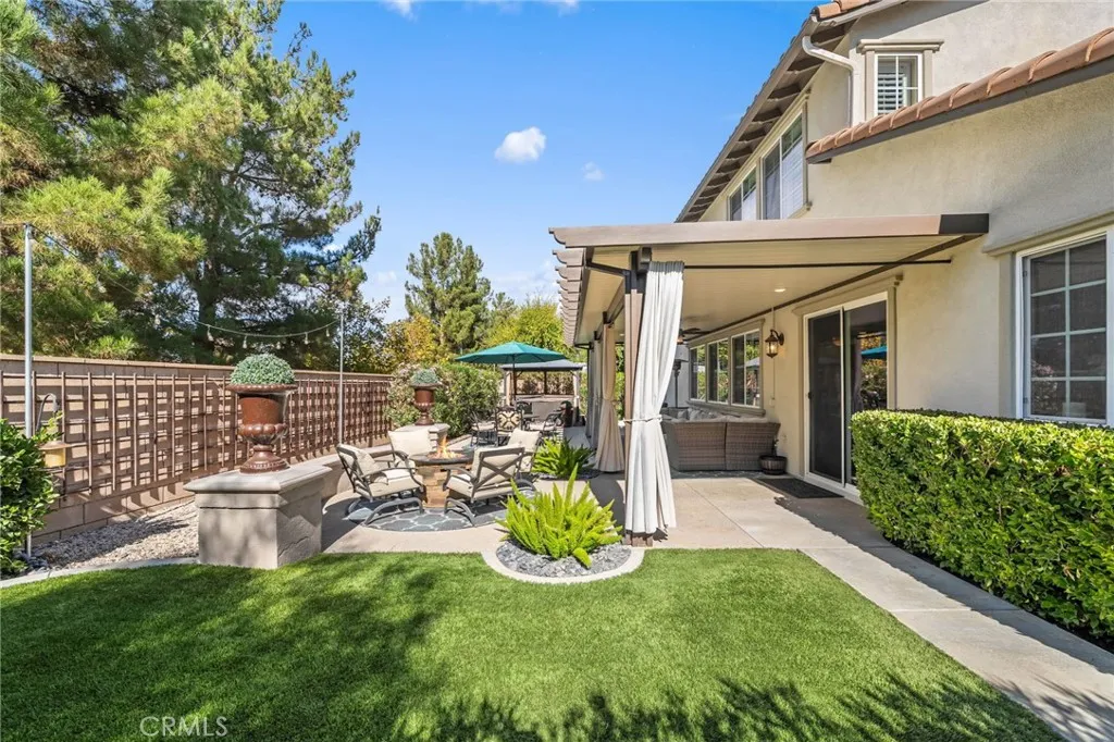 Welcome to 46331 Hunter Trail, a beautifully maintained former model home in the highly sought after Wolf Creek community of South Temecula. This spacious 5-bedroom, 3-bath, 3,506 sq ft residence offers refined finishes with sophisticated comfort. Step inside to a grand entry featuring vaulted ceilings, tumbled travertine tile flooring throughout the main living areas, and stylish beams setting a tone of timeless elegance. This open-concept layout includes a formal living room and formal dining room that flows right into a fantastic family room centered around a beautiful gas fireplace, surrounded by wood shutters, custom built-ins, and surround-sound wiring. This gourmet kitchen features granite countertops and backsplash, stainless steel appliances including double oven and gas cooktop, an oversized center island with bar seating, and abundant cabinet spaceperfect for gatherings and everyday living. Upstairs, enjoy wood-look luxury vinyl plank (LVP) flooring throughout, leading to a spacious primary suite with his and hers walk-in closets, dual vanities, a jetted tub, and a separate shower. Four additional bedrooms provide ample space for family, guests, including a home office. Step outside to your private backyard retreat featuring artificial turf, mature landscaping, and a covered above-ground spathe perfect spot to relax and enjoy Temeculas beautiful evenings. The covered patio provides additional space for outdoor dining and entertaining, all with low-maintenance appeal. Additional highlights include a downstairs bedroom and full bath, custom wrought-iron staircase,
