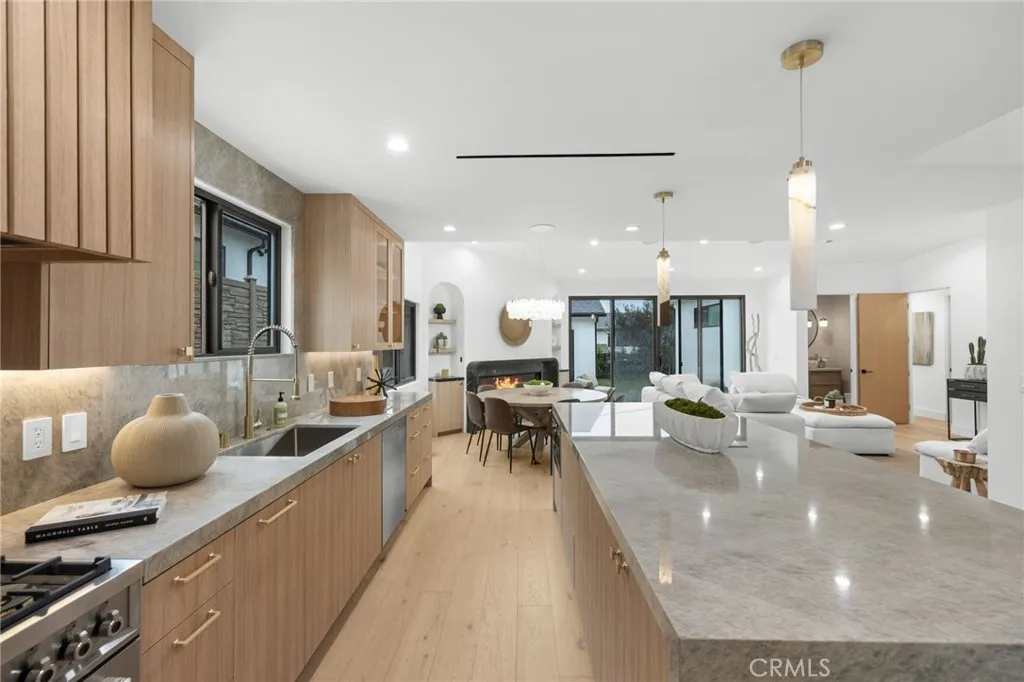 Stunning rebuilt and expanded home in the Burbank Hills showcasing exceptional design and craftsmanship throughout. A striking 8ft custom front door with light panel welcomes you into an impressive 11 ft formal entry that opens seamlessly to the showpiece kitchen. Custom white oak cabinetry, a handcrafted stove hood, glass display cabinets, and high end appliances anchor the space, complemented by a 10 ft floor center island finished in natural Allure quartz with a waterfall edge and seating for six. The expansive living and dining areas feature soaring ceilings with walls of windows and doors which flood the space with natural light. The generous gathering space opens to the outdoors, and features a beautiful new gas fireplace with curved stone mantel, built in bookshelves, and custom cabinetry- perfect for both entertaining and everyday comfort. The conveniently located powder room off of the living area is a true showstopper with portolan limewash. The home offers three bedroom suites, including a luxurious primary retreat with a spa-inspired bathroom. Enjoy a walk in shower with soaking tub, 72 inch vanity, smart toilet, and a modern LED lit walk in closet. The additional bedroom suites each include their own private bathrooms, custom closets and high ceilings. A walk-in laundry room with a sink is located adjacent to the kitchen. The designer landscaped grounds are not to be missed- featuring a Weber BBQ, a concrete fire pit, and a tranquil water feature that enhances the curb appeal and outdoor living experience.There is a versatile two car garage that provides the id