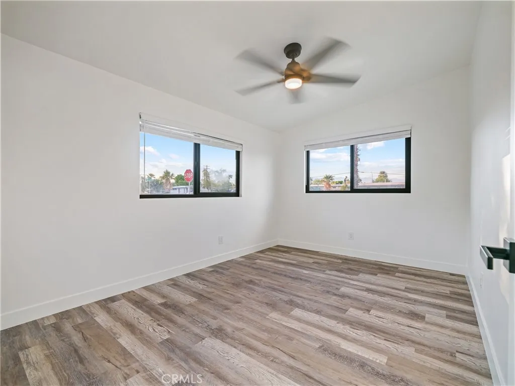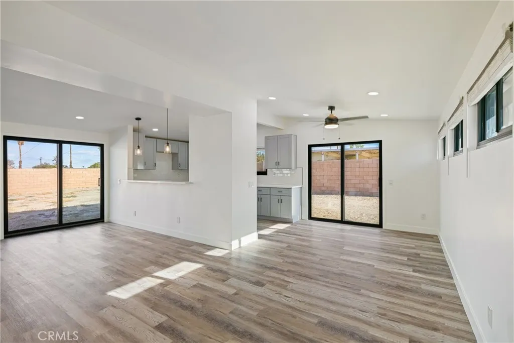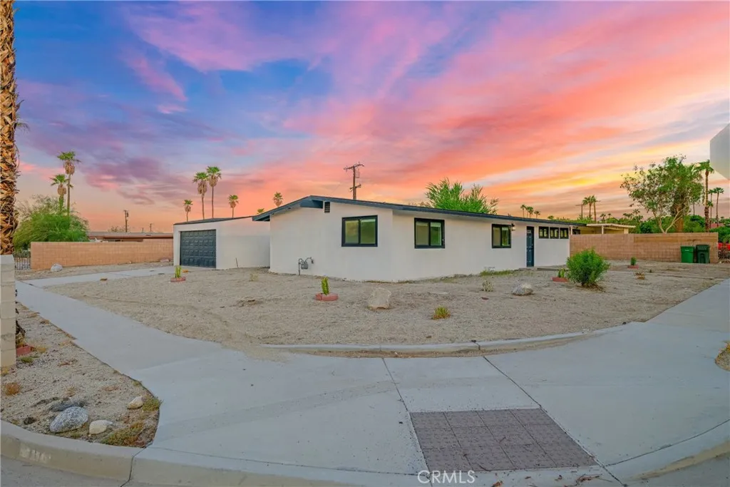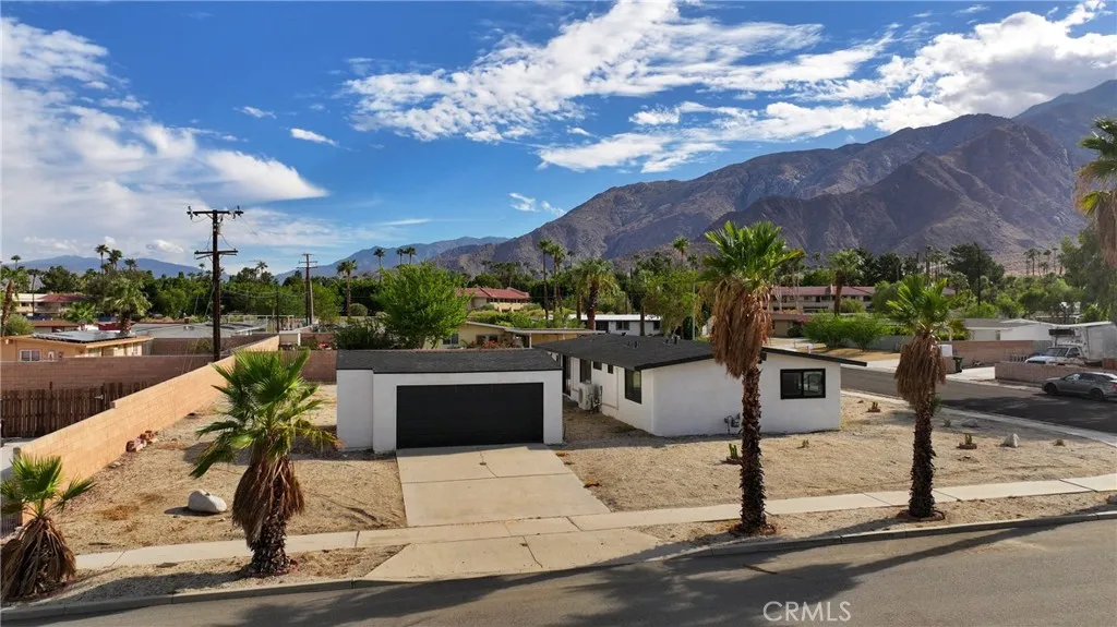 Welcome to Gateway EstatesNO HOA, a rarity in nearby communitieswhere this corner-lot renovation takes in the San Jacinto backdrop and leans into easy desert living. Inside, black-frame dual-pane vinyl windows and recessed LED lighting keep the spaces bright and calm. The kitchen layers shaker cabinetry, quartz slab counters, and subway tile, with a long serving bar that opens to the living area for effortless gatherings. Two refreshed baths showcase large-format tile and clean, modern fixtures; durable LVP ties the rooms together with a cohesive look. Comfort is handled by a whisper-quiet ductless mini-split that heats and cools efficiently, and an upgraded electrical panel adds everyday confidence. Outside, the oversized, mostly walled yard is ready for your visionpool, spa, fire pit, or water-wise landscape (buyer to verify). The detached garage includes washer/dryer hookups; it is a garage (not an ADU), though ADU potential may be explored with the City. North-end location close to Uptown/Downtown Palm Springs, the Aerial Tramway, dining, and shops. The City regulates short-term rentals by neighborhood; buyers should confirm current eligibility and requirements for this address. Buyer to verify all permits, square footage, lot size, and ADU feasibility.