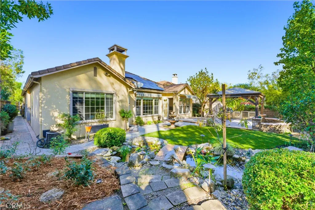 Welcome to the highly sought-after gated community of the Presidential Collection in Fullerton! This exceptional single-level former model home has never been sold before and with 3,141 sq. ft. of refined elegance. Designed with impressive high ceilings, engineered wood flooring throughout, recessed lighting, custom paneling, and crown molding, the home exudes timeless sophistication from the moment you enter. The open floor plan features 3 bedrooms, 2 full bathrooms and a half bath, a formal living room, formal dining room, a den or office space, spacious family room, and a bright breakfast nook. The gourmet kitchen is perfect for entertaining, complete with a built-in refrigerator and generous workspace. The luxurious primary suite provides a true retreat with a massive spa-inspired bathroom and a private workout room and a custom closet system. Step outside into your own resort-like oasis boasting a tranquil pond, in-ground hot tub, barbecue island, gazebo, and lush professional landscapingperfect for relaxation or hosting unforgettable gatherings. Additional highlights include an inside laundry room, epoxy-coated garage flooring, direct garage access, and an energy-efficient solar system. Located within top-rated Fullerton schools and just minutes from Brea Mall, Coyote Hills Golf Course, Downtown Fullerton, freeway access, parks, shopping, and dining. With low HOA dues, elegant finishes, and an unbeatable location, this home is truly a must-see!