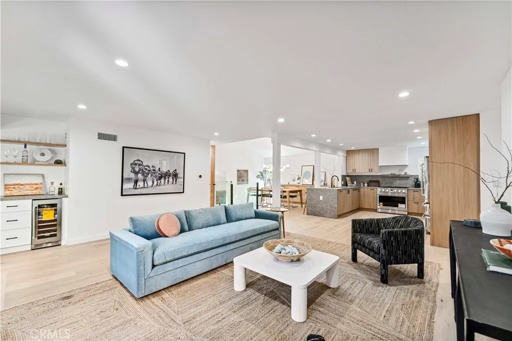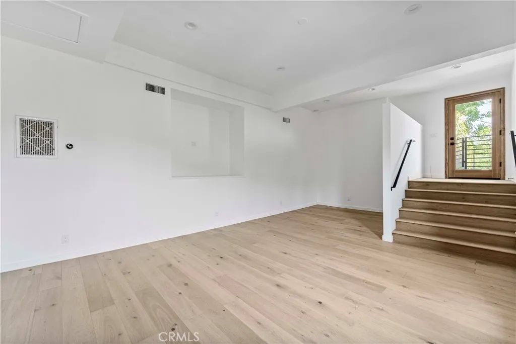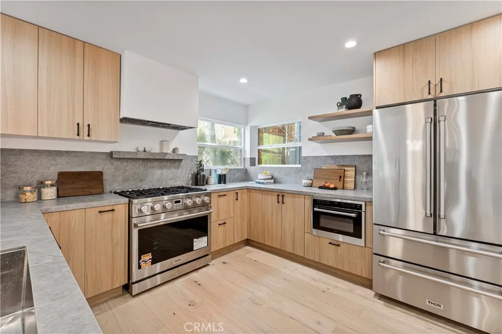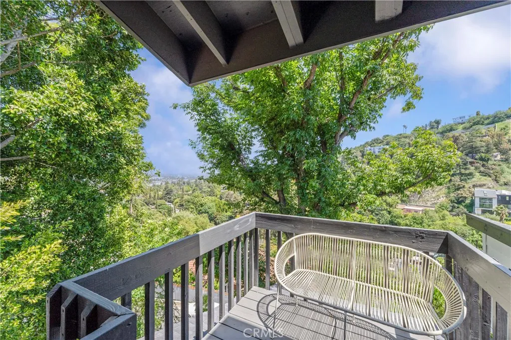 Stunning contemporary residence in the Sherman Oaks hills. This spacious 4-bedroom, 5-bath home offers an open floor plan with abundant natural light, high ceilings, and multiple view balconies. The main level features large living and family rooms, an updated kitchen with shaker cabinetry, stone counters, center island, and high-end appliances. A private en-suite bedroom on the main floor is ideal for guests or a home office. Upstairs, the primary suite includes a dual-vanity bath and serene canyon views. Two additional bedrooms share a jack-and-jill bathroom. A separate bonus room with its own 3/4 bath provides flexible use as an office, gym, or media space. Additional features include new engineered wood flooring, dual HVAC systems, an elevator, built-ins, wine fridge, and an attached two-car garage. The property offers a private, low-maintenance backyard bordered by mature hedges, plus multiple balconies with canyon and city-light views. Conveniently located near Sherman Oaks shopping, dining, and commuter routes with easy Westside access.