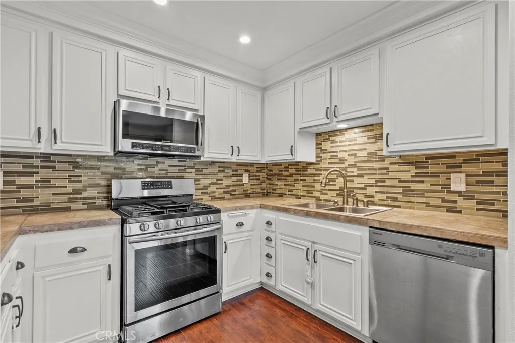 Welcome to this beautifully maintained end-unit 3-bedroom, 1.5-bath townhome in the highly sought-after Vista Fairways community of Valencia! Located just steps from one of the three community pools and backing the scenic Valencia Golf Course, this home offers privacy, convenience, and resort-style living. Step inside to vaulted ceilings, crown molding, and an office nook, with upgraded engineered wood flooring downstairs and plush carpet and tile upstairs. The kitchen features Samsung appliances, painted cabinets, while beautifully updated bathrooms, including a downstairs half bath, add modern comfort. Enjoy natural light from newer dual-pane windows and a sliding glass door leading to a partially covered private patio. The primary bedroom boasts a walk-in closet and included TV with wall mount, and the other 2 bedrooms features a built-in closet with custom paint. Additional upgrades include a finished garage with epoxy flooring, ample storage, attic access, newer vents and door knobs, a 3-year-old water heater, and a yearly-serviced HVAC system. Ring doorbell installed for added security. Perfectly situated near top-rated Meadows Elementry school, shopping, dining, California Institute of the Arts, College of the Canyons, and with easy access to the 5 Freeway, this meticulously cared-for home blends comfort, style, and conveniencemove in and enjoy!