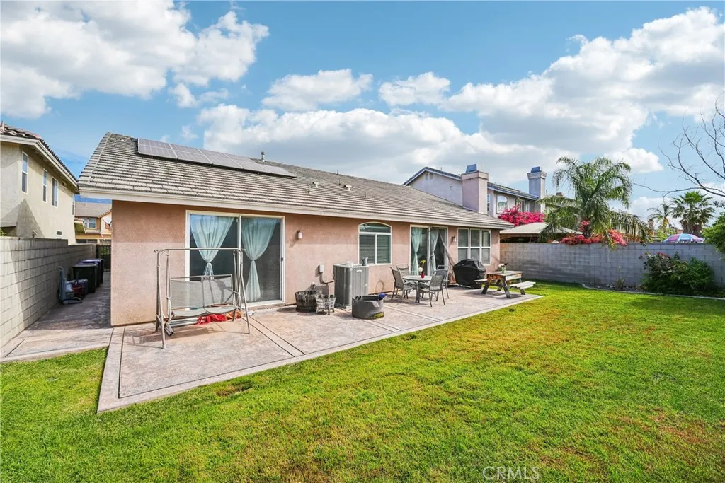 Beautiful 3-bedroom home with a spacious ensuite off the master bedroom with 2 bathrooms, located in the highly desirable North Fontana community within the acclaimed Etiwanda School District. This beautifully maintained residence is part of the Harmony Addition by Centerstone Estates, recognized for its commitment to green living-and it comes with PAID OFF SOLAR. Step inside to find a formal living and dining area, a cozy family room with a fireplace and built-in surround sound wiring, and stylish hardwood floors throughout the entryway, living room, and kitchen. The gourmet kitchen features granite countertops, stainless steel appliances, and a convenient breakfast bar-perfect for everyday living and entertaining. Additional features include custom interior paint and lighting, ceiling fans in every bedroom and the family room, and a dedicated laundry room with a sink and extra cabinetry for ample storage. Enjoy the well- manicured front yard and a generous backyard ideal for outdoor dining, relaxation, and entertaining guests.