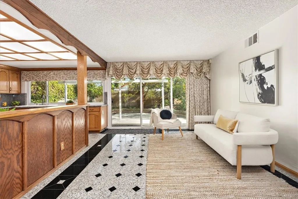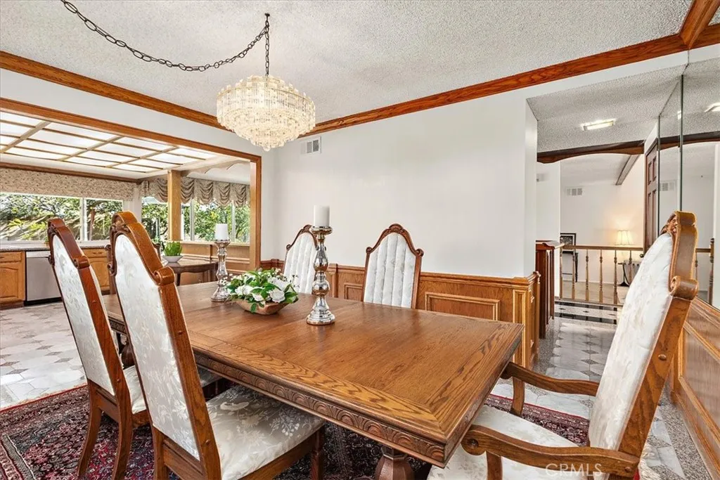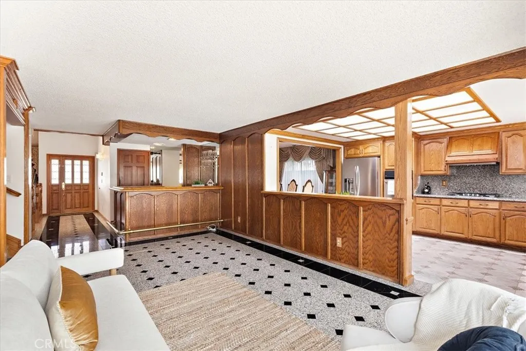 Ideally tucked away on a quiet cul-de-sac, this inviting home enjoys a prime location walk to highly desirable Wittmann Elementary, Frontier Park, Whitney High-ranked #1 in CA by US News(Entrance exam required), and Cerritos Park East offering full range of sports and recreation activities. Featuring a rare, highly sought-after floor plan with an exceptional convenience of 3 bedrooms 2 bathrooms on main level, plus another bedroom upstairs alongside an enormous bonus room and an open loft. Upon entry, you are welcomed by impressive volume ceilings that immediately create a sense of space and light, beautifully enhanced by a large skylight overhead. Decorative and elegant granite tile flooring flows seamlessly from the entry through the family room, kitchen, and formal dining room, setting a refined and cohesive tone throughout the main living areas. The living room feels warm and intimate, highlighted by plush carpeting and a classic tile fireplace faade, mantle and hearthA perfect space for connecting and relaxations. The bright and welcoming kitchen is thoughtfully upgraded with granite countertops, a full-wall granite backsplash, and abundant solid oak cabinetry. It integrates effortlessly with the formal dining room, the family room, and a large sliding door leading to the backyard, making everyday living and entertaining feel natural and connected. An open bar further extends the entertaining space, linking the living room to the family room with ease. Custom, intricately crafted wood details grace the entire first level, from striking front doors to staircase baluster