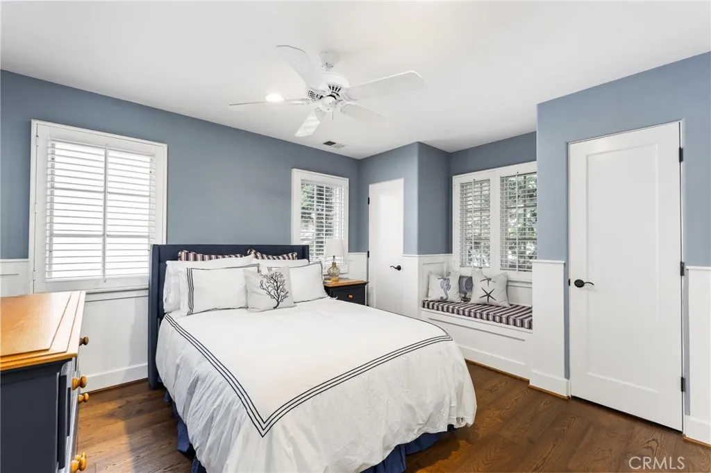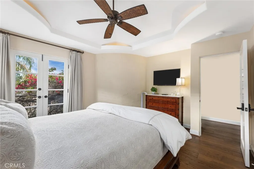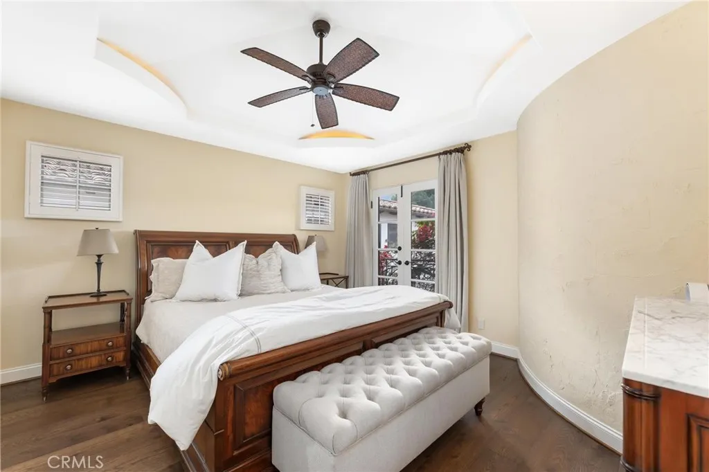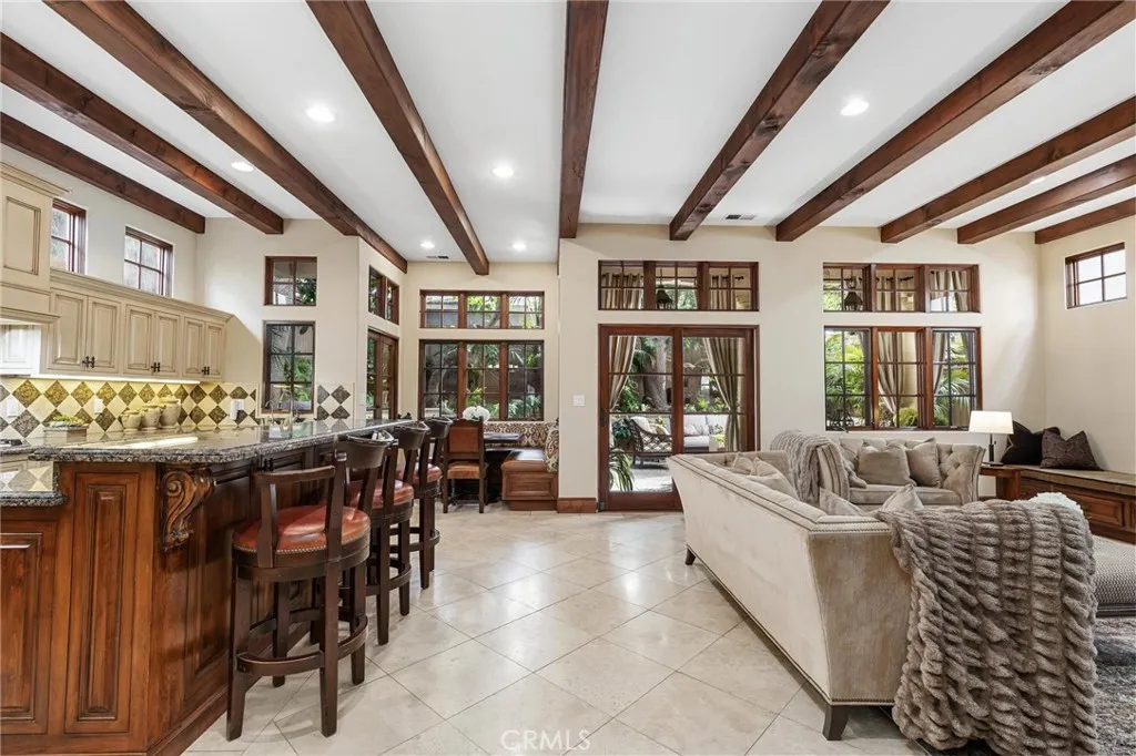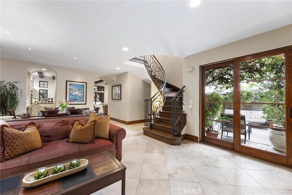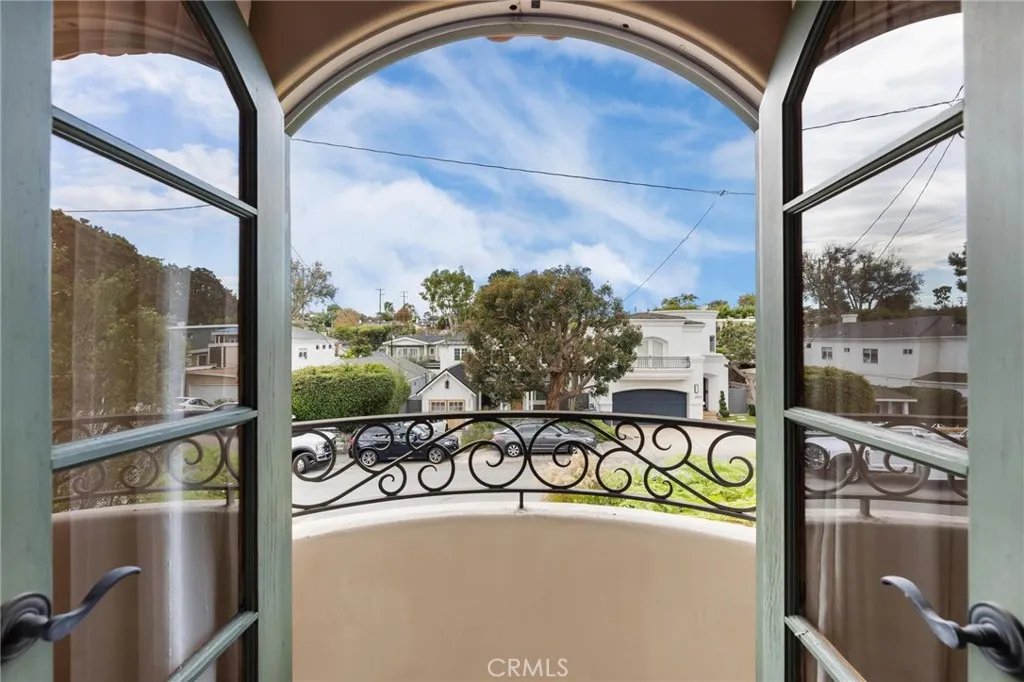 This distinguished Manhattan Beach residence is the longtime personal home of celebrated architect David Watson, whose Mediterranean Revival influence is reflected throughout the homes architecturally detailed and thoughtfully curated design. Travertine stone and hardwood flooring run throughout, reinforcing a sense of craftsmanship and timeless sophistication. Upon entering, an elegant foyer welcomes you with a well-appointed powder room and sightlines into the main living areas. Formal living and dining spaces sit just beyond, designed for intimate gatherings and entertaining. Transitioning seamlessly to the rear of the home, the open-concept family room and kitchen create a warm, relaxed heart of the residence featuring wood beam ceilings, a breakfast nook, and direct access to the backyard. The kitchen includes a recently replaced built-in Sub-Zero refrigerator, stainless steel appliances, dual ovens, a breakfast bar, and a walk-in pantry. Two fireplaces are located on the main level, both gas-ignited and wood-burning, adding character and functionality. The adjacent office contains two sets of French doors and overlooks a private interior courtyard with a fountain and a majestic bougainvillea-laced tower containing the winding ironwork staircase inside. Upstairs, the home offers five bedrooms, including the primary suite, a junior suite, and three secondary bedrooms. The west-facing primary suite features dual walk-in closets, a Juliet terrace, and a spa-inspired ensuite with dual vanities, soaking tub, glass shower, and a private water closet. The junior suitealso wes