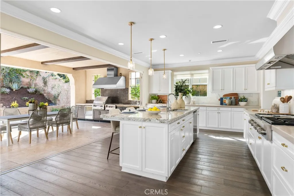 Tucked away at the end of a quiet cul-de-sac in the highly sought-after Woodbury community, this exceptional home offers a combination of privacy, space, and resort-style living on a rare nearly 9,000-square-foot lot. From the moment you enter, the home makes a striking impressiona grand two-story foyer highlighted by a crystal chandelier and refined wood accents, setting a tone of understated luxury and timeless elegance. Thoughtfully designed for multi-generational living, the home features five bedrooms, including three private suites. The ground-floor suite serves as a private retreat with its own bathroom, walk-in closet, kitchenette, and a separate entrance opening to a charming stone-paved side yard, offering exceptional flexibility. At the heart of the home, light-filled living and dining spaces unfold seamlessly. The living room features an elegant coffered ceiling and large picture windows overlooking the backyard, filling the space with natural light. The chef-caliber kitchen is anchored by a substantial granite island, complemented by quartz countertops, a full marble backsplash, and built-in high-end stainless steel appliances. Fully retractable bi-fold glass doors open to a beautifully designed courtyard with a built-in outdoor kitchen, creating seamless indoor-outdoor living. Every detail has been thoughtfully considered, from the discreet mini office and walk-in pantry near the garage entry to the custom garage cabinetry, integrated workbench, and dedicated shoe storageenhancing both function and organization. Upstairs, a versatile loft with custom media cab