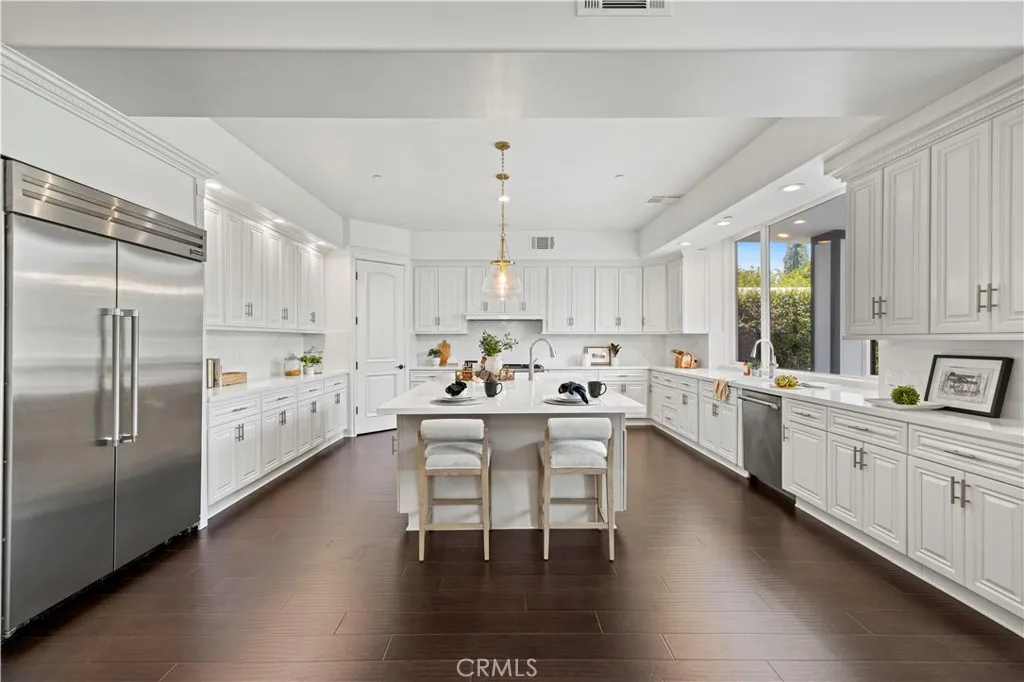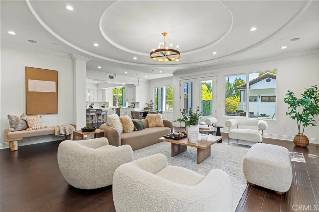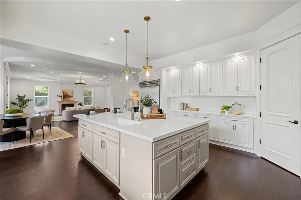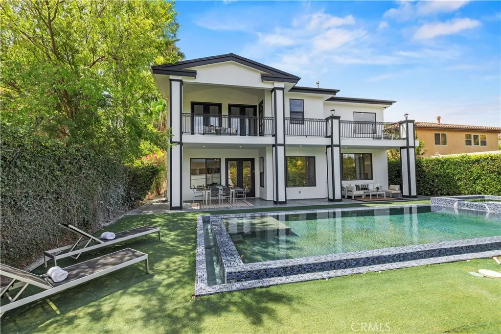 Tucked away at the end of a private cul-de-sac, this French Chateau inspired trophy estate offers timeless elegance, grand scale, and a rare detached ADU guest house. A dramatic double height foyer sets the tone, highlighted by a sweeping wraparound staircase and striking custom chandelier. The formal living room impresses with soaring ceilings, a statement fireplace, and towering bay windows that fill the space with natural light. Designed for both everyday living and entertaining, the chefs kitchen features custom cabinetry, a generous center island, high end stainless steel appliances, and an expansive walk in pantry. The kitchen opens seamlessly to the family room with fireplace and French doors, creating exceptional indoor outdoor flow. All five bedrooms are oversized, each offering ensuite bathrooms and walk in closets. The romantic primary suite is a true retreat, complete with a private foyer, sitting room, dual walk in closets, a spa inspired bath with custom shower and soaking tub, and a private balcony. The entertainers backyard provides a resort style setting with pool, spa, covered patio, and low maintenance turf, ideal for gatherings or quiet relaxation. The detached guest house includes a spacious living area, full kitchen and bath, and a large bedroom, perfect for guests, multigenerational living, or additional income potential. An extraordinary custom estate that blends sophistication, comfort, and versatility. This is a must see home.