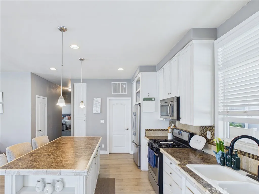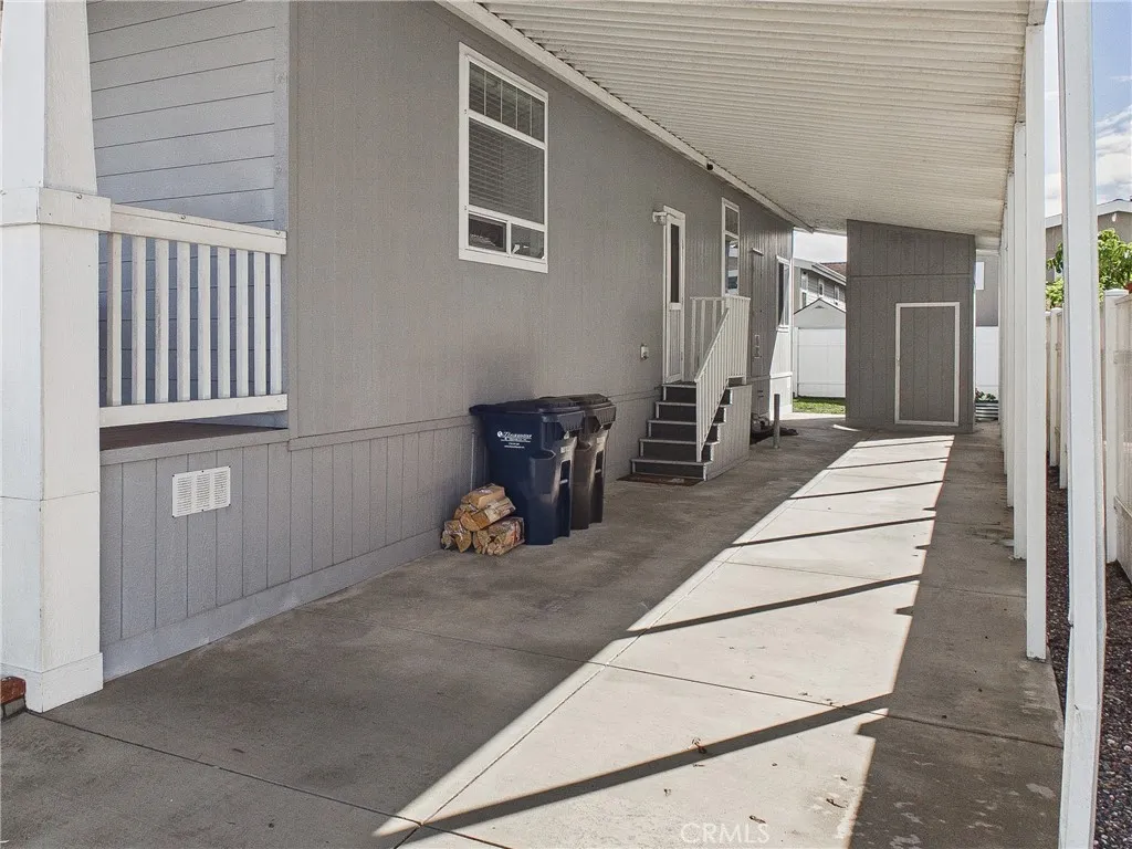 A modern, beautifully upgraded manufactured home offering refined finishes, thoughtful customizations, and one of the most exceptional backyard spaces in the Huntington Shorecliffs community. From the moment you step onto the inviting covered front porch, the quality and intentional design are evident. Inside, vaulted ceilings, recessed lighting, crown molding, and wide plank flooring create a bright, elevated living environment with a clean, contemporary feel. The open-concept living room flows seamlessly into the kitchen and dining area, creating an ideal layout for both everyday living and entertaining. The kitchen serves as the centerpiece of the home, featuring white cabinetry, stainless steel appliances, a large center island with bar seating, pendant lighting, and generous counter space. Clear sightlines across the main living areas enhance both flow and functionality. The primary suite is generously proportioned and highlighted by a tray ceiling with crown molding detail, along with an en-suite bathroom offering dual sinks, a soaking tub, separate shower, and a walk-in closet. The second and third bedrooms are positioned privately and share a full hall bathroom, providing a practical and well-designed layout for guests, family members, or flexible use such as a home office or fitness room. What truly distinguishes this property is the expansive, landscaped, fully fenced backyard a rare and highly desirable feature within Shorecliffs. Unlike the majority of homes in the community, this residence offers substantial usable outdoor space with grass, privacy fencing, an