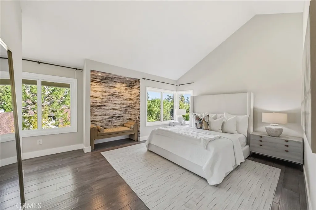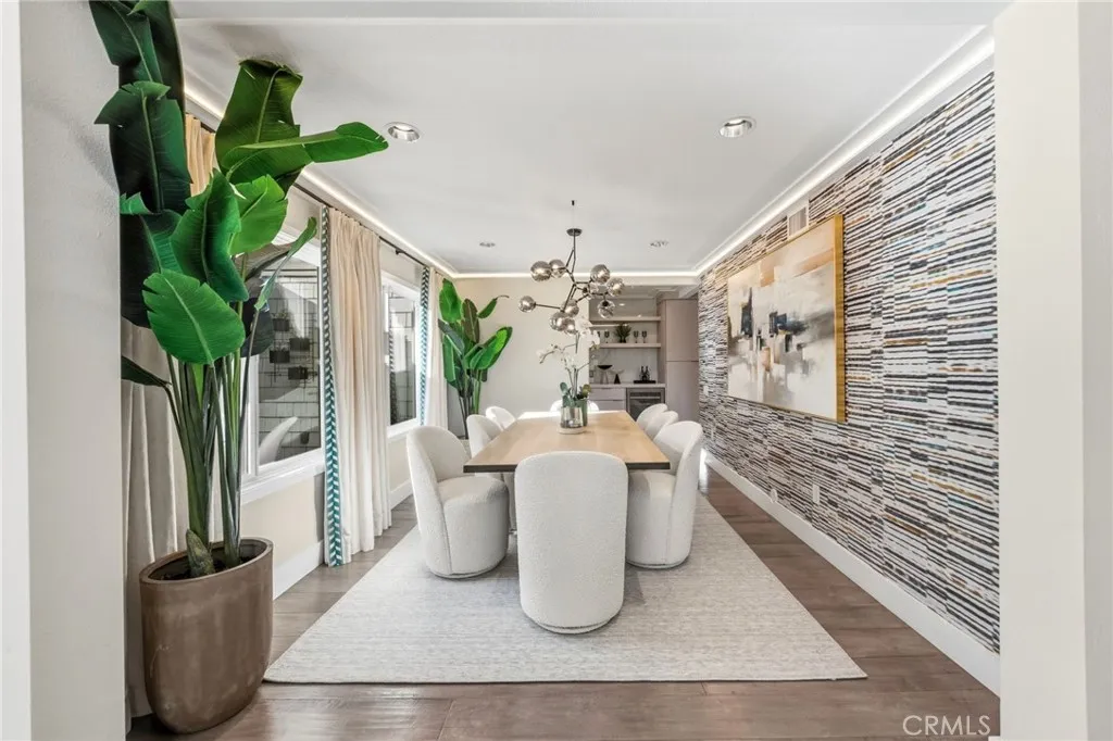 Welcome to this stunning 5-bedroom, 3-bath Orange County retreat where resort-style living meets everyday comfort in one of Irvine's most sought-after neighborhoods. From the moment you step inside, soaring ceilings and sun-drenched living spaces exude warmth and sophisticated contemporary styling throughout this beautifully maintained 3,000 sq. ft. home. The heart of the home is a sleek, well-appointed kitchen featuring quartz counters, custom cabinetry, and a chef-inspired appliance suite perfect for everything from casual family meals to elegant entertaining. A gracious living room anchored by a stunning ledger stacked stone fireplace flows effortlessly to the dining room, while a convenient downstairs bedroom and full bath offer ideal flexibility for guests or multigenerational living. Wide plank wood flooring, soaring ceilings, solid core doors, 5-inch baseboards, and newly installed energy-efficient windows speak to the quality of finishes found throughout. Upstairs, the spacious primary suite is a true sanctuary, complete with a spa-inspired bath featuring a soaking tub, walk-in shower, dual vanities, and a generous walk-in closet, while three additional bedrooms and a dedicated home office provide space and flexibility for every lifestyle. Step outside to your own private paradise a breathtaking pool and spa framed by soaring palms, lush tropical landscaping, and elegant stone pillar accents with cascading water features, all flowing seamlessly to a generous covered patio where a pendant-lit dining area and built-in BBQ set the stage for unforgettable gatherings u