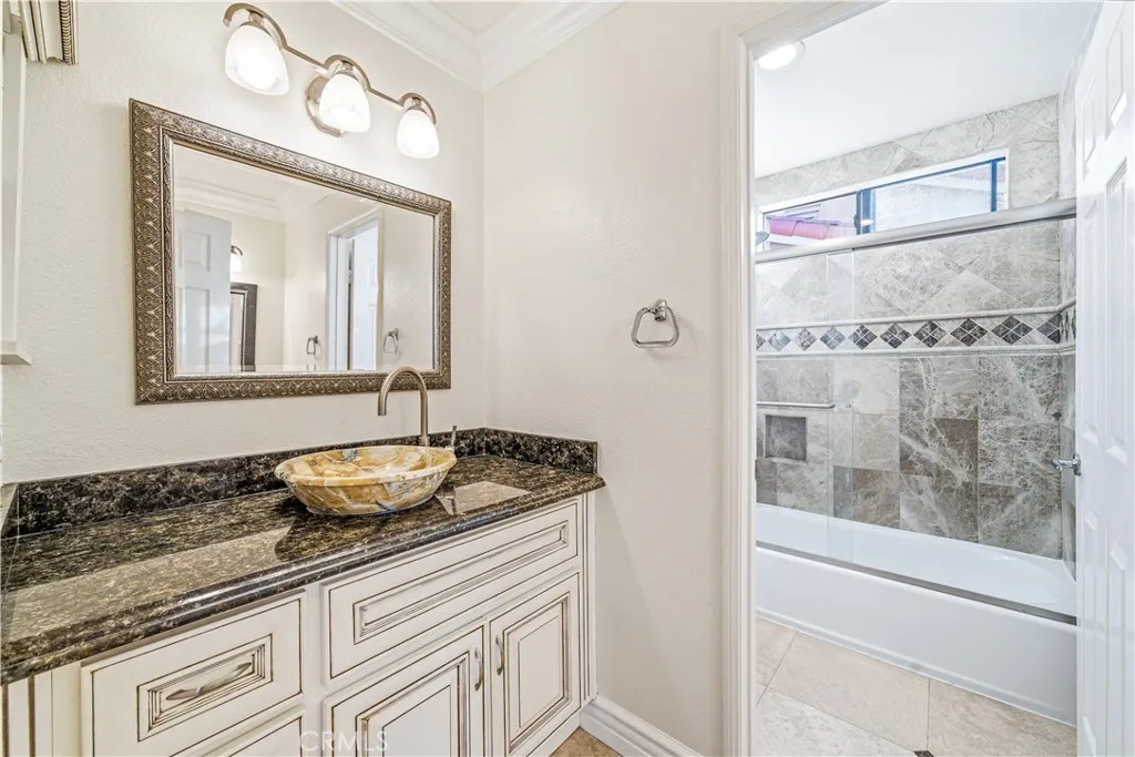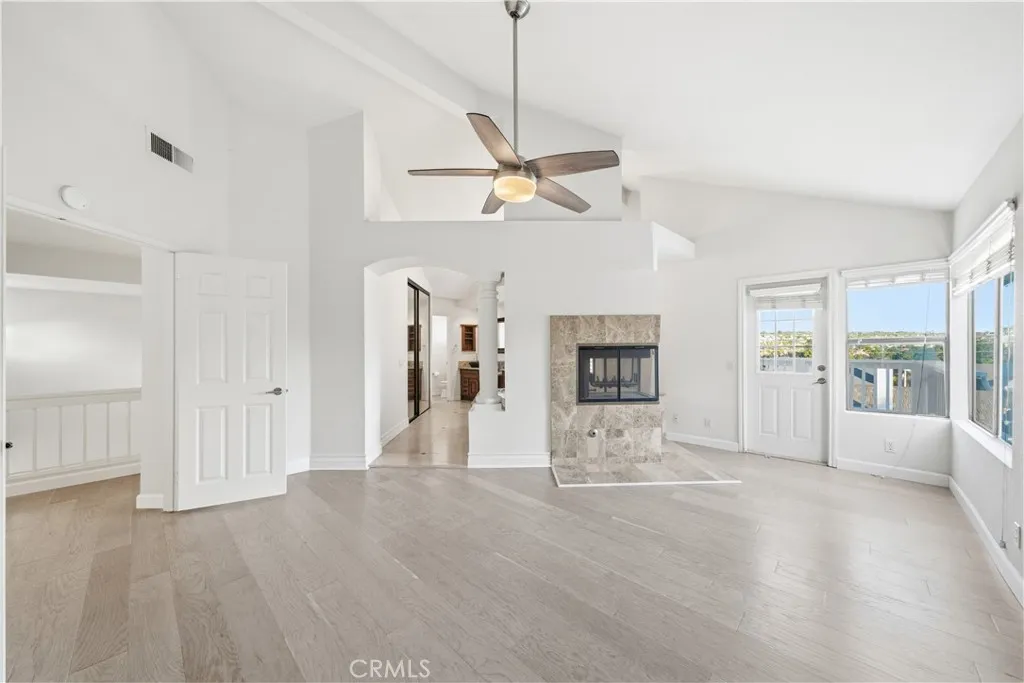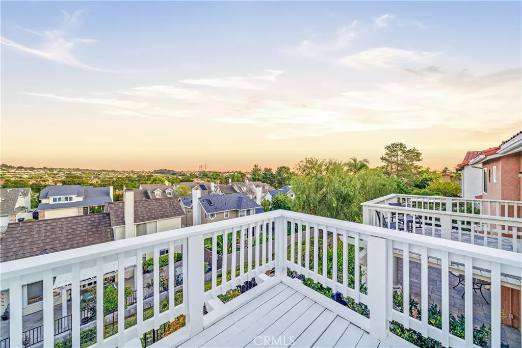 Nestled in the prestigious heart of Mission Viejo, this 4-bedroom, 3-bathroom masterpiece offers an unrivaled lifestyle just moments from the serene Lake Mission Viejo, premier dining, excellent shopping, commuting options, top-tier schools, and scenic hiking and biking trails. This rare jewel redefines luxury living with breathtaking, sun-drenched architecture, meticulous custom detailing, and panoramic views of city lights, green hills and Saddleback Mountain. Be welcomed by a serene, beautifully landscaped exterior featuring mature palm trees, custom lighting, and a tranquil fountain that anchors a welcoming conversational seating area. Step into a breathtaking, light-filled entry with soaring ceilings, engineered wood flooring, custom baseboards, neutral paint and designer finishes. The formal dining room features elegant custom columns sure to set the tone for your formal event, while the expansive family room features a striking see through triple-sided granite fireplace, which is shared with the eat-in kitchen and has direct access to the outdoor patio. Featuring warm and intriguing granite countertops, custom cabinetry, stainless steel appliances, and a serene view from the over the sink window, the kitchen will be the heart of the home with a dedicated eat-in space and the vibe from that fireplace. A convenient downstairs bedroom, an updated three-quarter bath and an inside laundry room with garage access completes the lower level. Upstairs the oversized primary retreat features a private balcony with sweeping views, a double-sided fireplace that leads into the spa