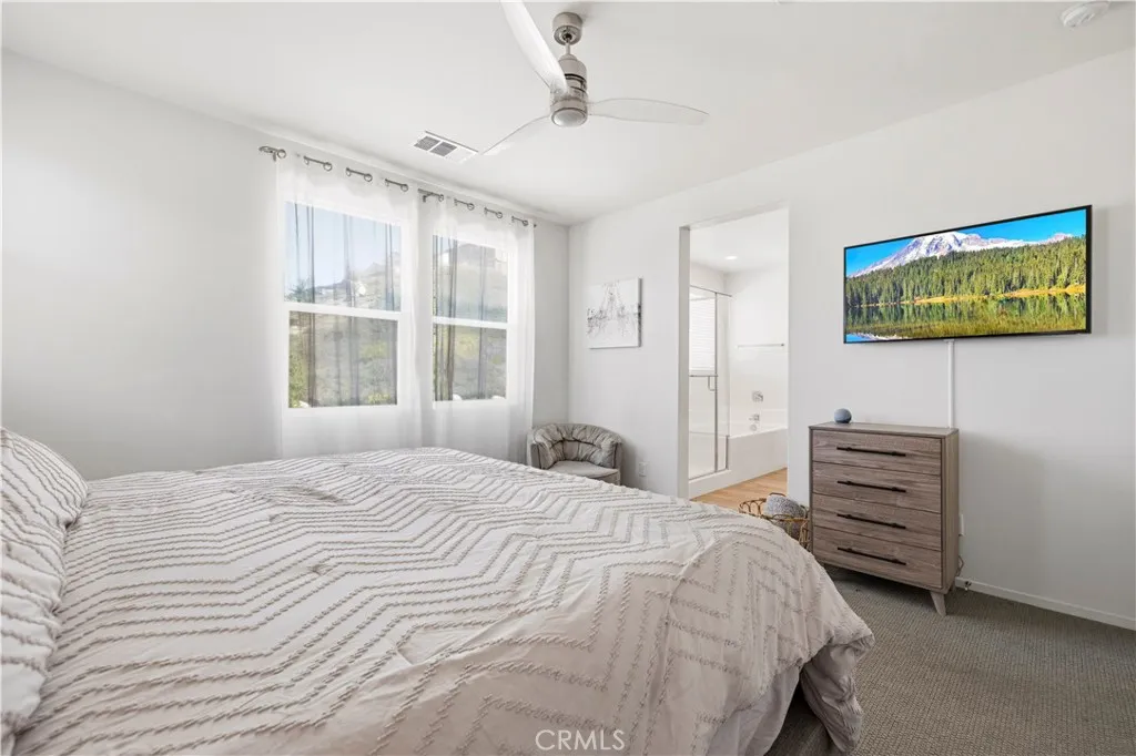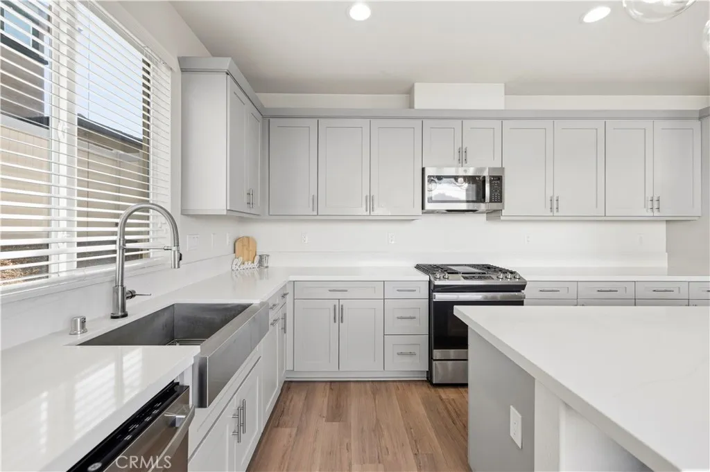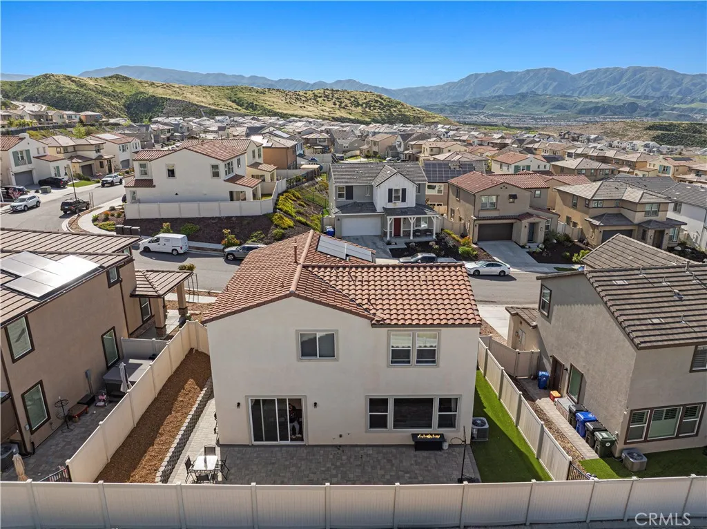 This stunning beauty is located in the Sola community of the highly sought after Skyline Ranch community and includes OWNED SOLAR! It boasts 3 bedrooms, 2.5 baths, PLUS a downstairs den/office space, and an already landscaped backyard. Your open concept kitchen includes quartz countertops, grey shaker style cabinetry, stainless steel appliances and farmhouse sink, a center island doubling as a breakfast bar, and a pantry. Natural light pours in through the large picture window in the living room. Backyard sliders take you to your low maintenance, hardscaped backyard with pavers and a side yard with artificial turf. Upstairs you'll find your 3 bedrooms, 2 full bathrooms each with double sink vanities, and a dedicated laundry room for added convenience. Your spacious primary suite features its own ceiling fan, a walk-in shower, soaking tub, and a large walk-in closet. Your home also features a tankless water heater. Located walking distance to the Skyline Ranch park which has a full size basketball court, two tennis/pickleball courts, a baseball diamond, multi-purpose field, playground, walking trails, and a gazebo with picnic benches. Two streets up youll find Basecamp, Skylines newest community addition, featuring panoramic views of SCV and resort-style amenities including a lap pool, spa, grill station, a covered open air oasis, clubhouse, and kids room. Additionally, residents have access to Skyline's larger clubhouse known as The Lookout (featuring a fitness center, BBQ area, pool, spa, splash pad, playground, fire pit, and entertainment areas), Sunset Park (featuring a