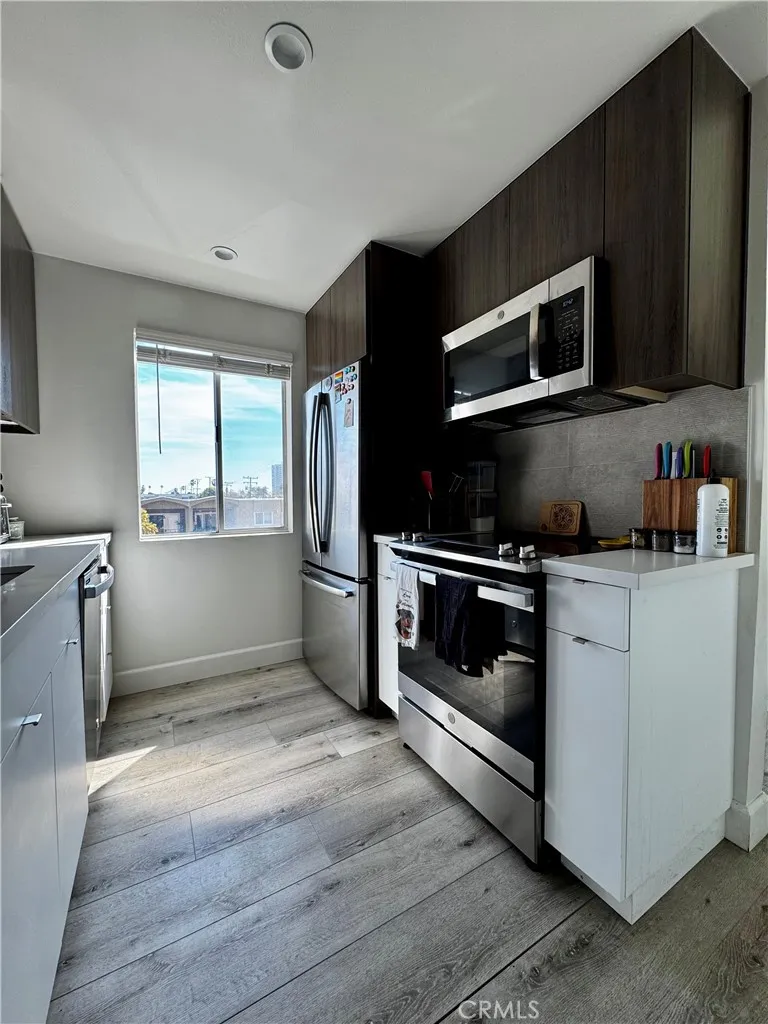 Located in the Bluff Park area, this condo is everything you are looking for. Located two blocks from the beach and one block from Bixby Park, this unit is a one bedroom one bath condo that has what not many condos in Long Beach have, an HVAC system! There is a large slider in the living room area that opens up to a Juliet balcony with a peek-a-boo view of the ocean. This unit features newer laminate floors throughout, recessed smart lighting and ceiling fans throughout, a kitchen that boasts quartz countertops on custom cabinets and backsplash, a bathroom with a walk-in shower with pebble tile flooring and beautiful tile to line the walls along with an accent tile wall behind the gorgeous vanity, and the large bedroom easily fits a king size bed with a large window to let in light and large beautiful closet doors. This unit is ready for you to move into! The unit comes with two parking spaces located in the garage which can only be accessed by remote. The building is home to a total of 12 units and has a laundry facility and elevator.