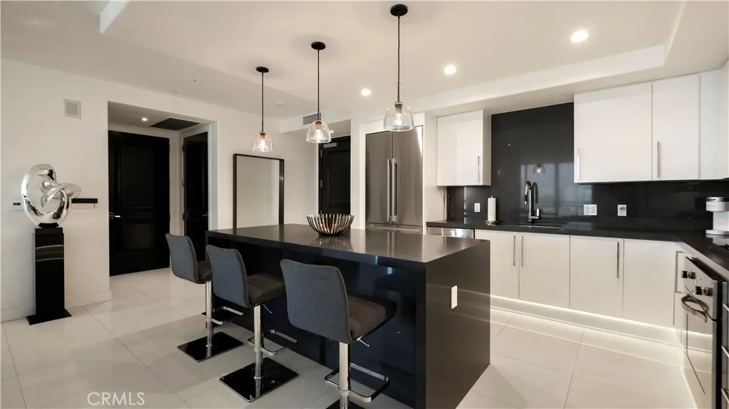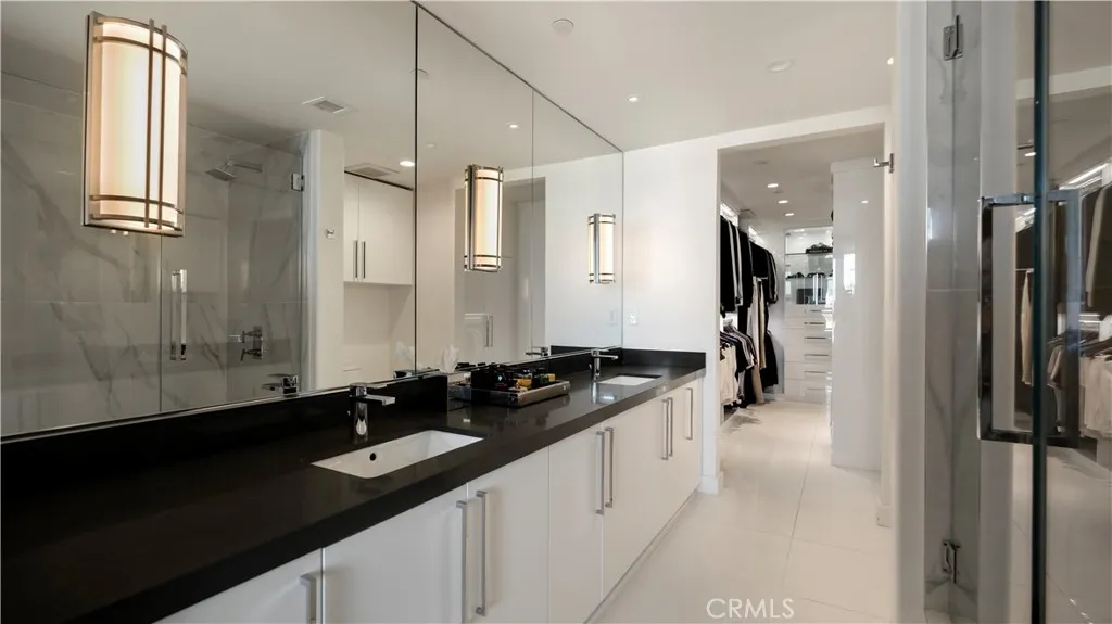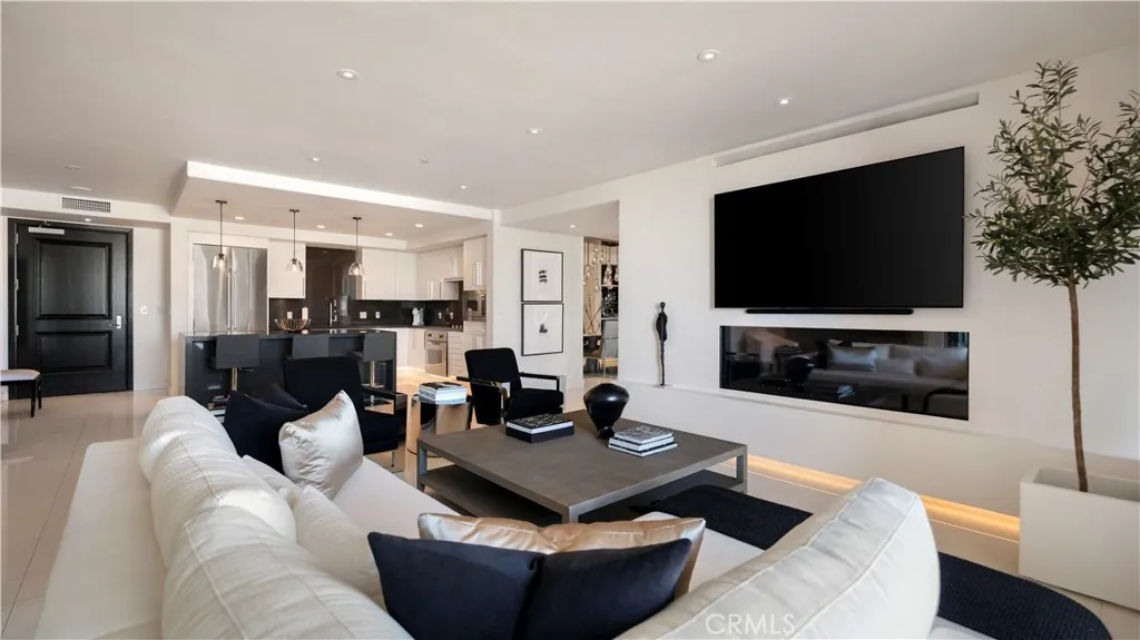 Welcome to 8085 Scholarship, a truly rare offering at The Plaza in Irvine. This extensively reimagined contemporary residence is the result of a tasteful combination of two units into one expansive, single level showpiece, creating a scale and layout seldom available in luxury high rise living. Fully gut renovated with a refined, contemporary design aesthetic, the home was rebuilt with meticulous detail. Brand new appliances, cabinetry, sinks, toilets, upgraded plumbing fixtures, and curated finishes throughout deliver a cohesive, designer environment that is completely turnkey. Clean architectural lines, beautiful white stone flooring, and walls of glass enhance the open concept layout, filling the residence with natural light while offering seamless flow for both elevated entertaining and comfortable daily living. The thoughtfully designed floor plan features two spacious primary suites, each serving as a private retreat with generous walk in closets and spa inspired baths appointed with premium materials and contemporary detailing. In addition, a dedicated office or primary retreat provides flexibility for remote work, a lounge, or fitness space. Two powder rooms add convenience for guests. A formal dining room introduces a sense of occasion, while a sophisticated bar area creates the perfect setting for hosting. The chefs kitchen anchors the main living space with top tier appliances, sleek stone countertops, and a greatly sized island that serves as both focal point and gathering hub. Practical luxuries further distinguish this offering, including four side by side par