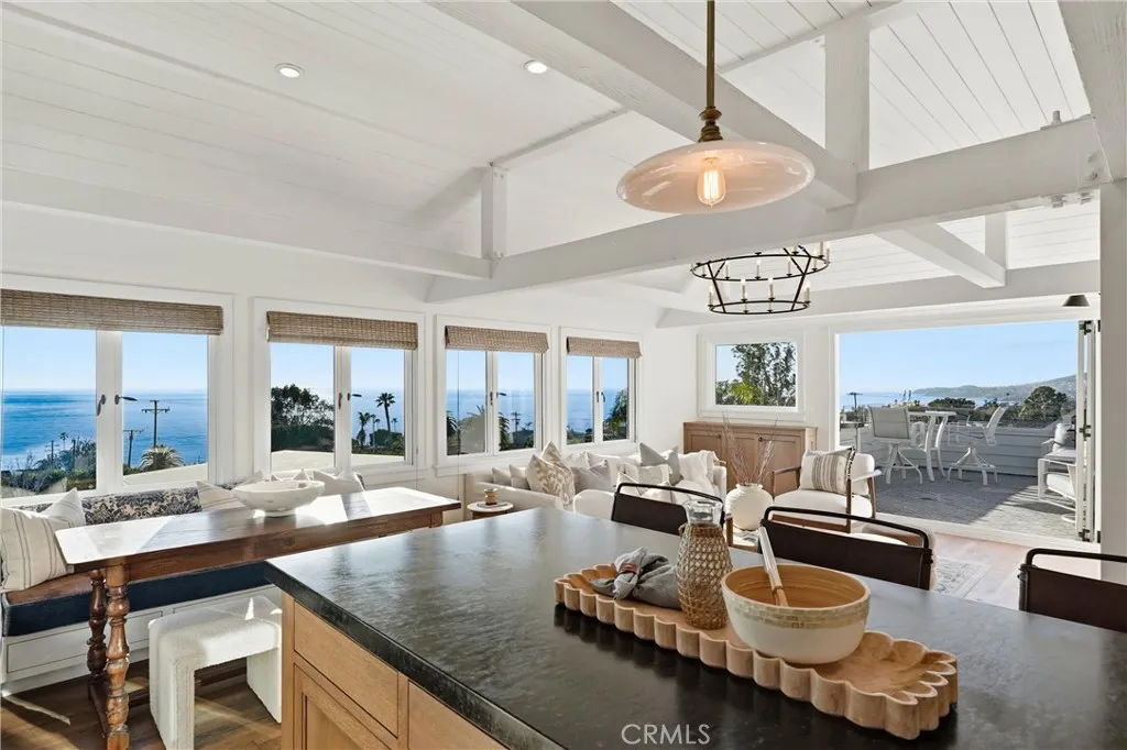 Just several blocks from world class beaches, this exceptional ocean-view coastal cottage blends timeless elegance with relaxed Laguna Beach living. Remodeled by award-winning designer Andra Miller, the home pairs classic East Coast charm with elevated California style and beautiful views of the Pacific coastline, creating a residence that feels both refined and relaxing. Approximately 2,200 square feet, the 3 bedroom, 3 1/2 bath residence features a thoughtful split-level layout that maximizes light and privacy, living far beyond its footprint with warmth, character, and intention at every turn. The entry level includes the primary suite, secondary bedroom with custom bookshelves and private bath, and a laundry room. The lower level offers a private guest suite with a private bath, Douglas firlined walk-in closet, and direct garage access. A spacious 2-car garage with storage cabinets, Level 2 electric car charger, provides added convenience and functionality. The primary bath is a spa-inspired bath with freestanding soaking tub, heated marble flooring, dual vanities, walk in closet and a steam shower. Beautiful ocean views from the primary Bedroom. The top floor includes a designer kitchen open to the living and dining areas and features a soapstone island, custom cabinetry with glass uppers, farmhouse sink, custom banquette, built in beverage refrigerator and premium appliances including a six-burner Viking range with griddle and a Sub-Zero refrigerator with dual temperature drawers. There is also direct access to your private deck providing indoor outdoor living. Ocean,
