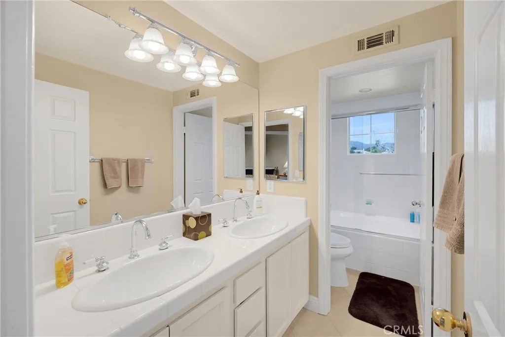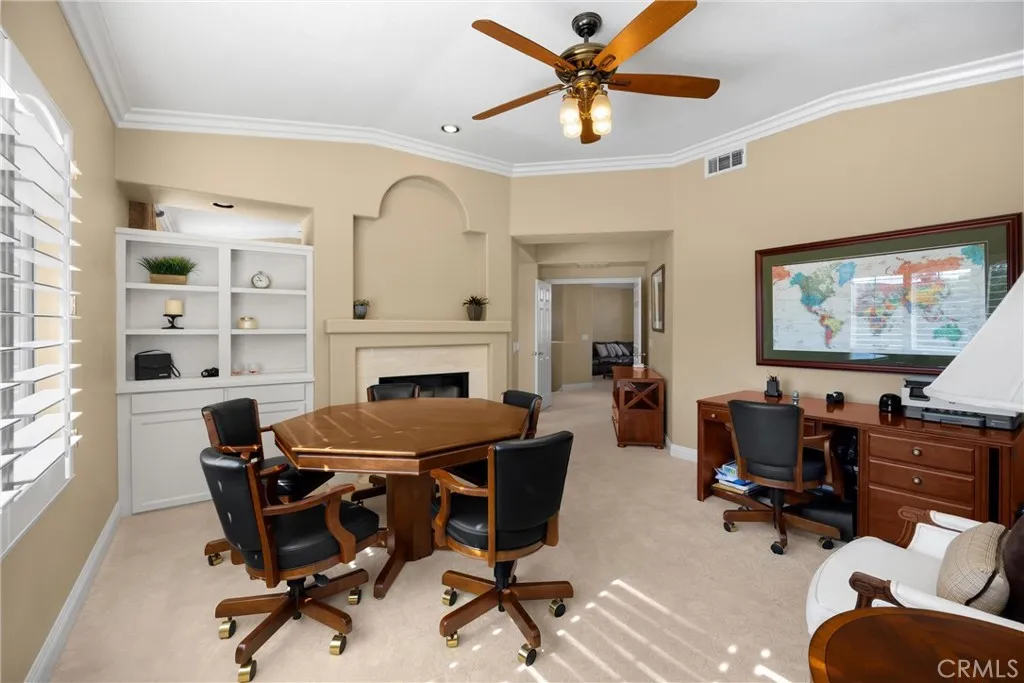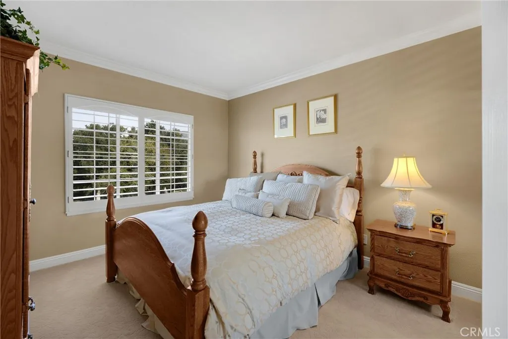 Stunning La Verne Heights home with views, comfort, and luxury! This home welcomes you thru leaded glass front doors and into the home's grand entryway with magnificent hardwood floors. The formal living room features patterned fabric carpet, custom window drapes, fireplace, and crown moldings on 10 foot ceilings. The formal dining room with mirrored wall, patterned fabric carpet, vaulted ceilings with crown molding, recessed lighting, and custom window drapes. The hardwood floors carry into the spacious kitchen with stainless steel appliances, granite counters, prep sink in island, recessed lights, and several windows to provide substantial natural light and views of the pool & yard. The kitchen is open to the down-level family room featuring wood floors, crown molding, window shutters, fireplace, and door leading to the outdoor patio. Main level secondary bedroom is complete with patterned carpet, window shutters, crown molding, and en suite bathroom with walk in shower and doorway to the side yard. Finally the laundry room with sink and powder room complete the main level. The curved staircase takes us to the second level where the large den/loft, 2 large guest bedrooms, guest full bath with dual sinks, and primary suite are located. The primary bedroom features double entry doors, a sitting room/office, fireplace, window shutters, patterned carpet, ceiling fans, window drapes, and double doors to the primary bathroom. This is where we have dual vanities, makeup counter, separate tub and walk-in shower, crown molding, window shutters, and huge walk-in closet. The rear ya