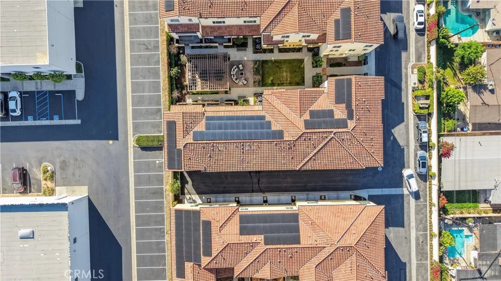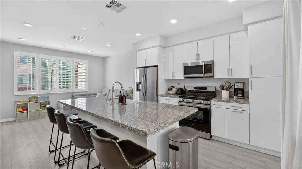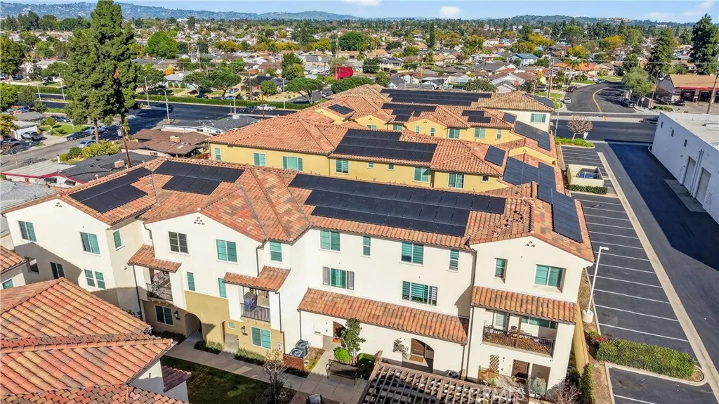 Welcome to 14116 Bay Street, a thoughtfully upgraded tri-level condominium in the desirable Laurel Walk community of La Mirada. Built in 2022, this modern condo is favorably situated within the community, just steps from the outdoor BBQ area and fire pit. The home far exceeds builder standards, offering a rare combination of sustainable energy, sophisticated air and water purification, and custom luxury. The homes commitment to efficiency is anchored by an owned Sunrun solar system (2.72 kW) with Protection Plus, providing significant long-term energy savings. The interior features whole-house recessed lighting, plantation shutters, and premium flooring throughout. The second level offers a bright, open floor plan with modern laminate flooring and a gourmet kitchen that is a true centerpiece. It boasts sleek granite countertops, a deep farmhouse sink, custom white cabinetry with soft-close drawers and full-extension slides, and high-end Samsung stainless steel appliances. A reverse osmosis water filtration system and a private balcony just off the living area make this the perfect space for both daily living and entertaining. Energy efficient and clean at its core, the home features a Nest smart thermostat, a tankless water heater, and a professional-grade Lennox PureAir HVAC purification system for superior indoor air quality. The upper level features plush, premium Berber loop carpet leading to the primary suite with a ceiling fan in the primary bedroom and a spa-like ensuite. Located in between both bedrooms on the upper level is the laundry closet for ease and convenien