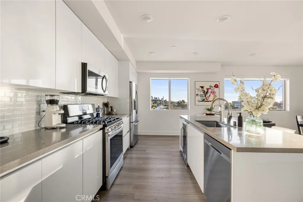 Updated 2-bedroom, 2-bathroom condo with city views, vaulted ceilings, and two private patios. Third-floor unit with a private walkway directly to your door no shared hallways. The renovated kitchen features Samsung stainless steel appliances, a built-in wine fridge, quartz countertops, and a tile backsplash. Both bathrooms have been upgraded with glass shower doors and new lighting with dimmers. The primary suite includes a spa-style shower head and its own patio access. Wide plank vinyl flooring runs throughout. Custom built-ins and a media center anchor the living space, flowing seamlessly into the kitchen cabinetry. Fresh paint, custom blinds, and updated lighting throughout. Two private patios offer sweeping city and foothill views. Two gated, side-by-side subterranean parking spots with elevator access to the third floor. Extra storage in the secured garage. The 34-unit boutique building features a rooftop terrace with panoramic views, a central atrium courtyard, and a recreation room. Open floor plans, abundant natural light, and low-density living just 34 homes across 42,000 square feet. Walking distance to Americana at Brand. Erewhon opening nearby.