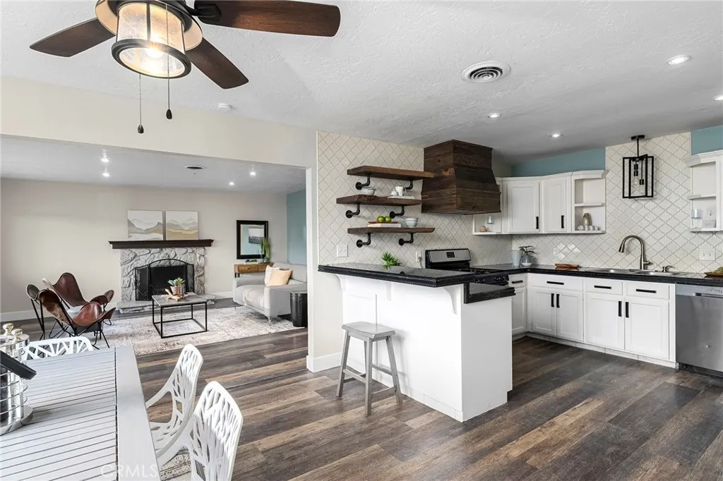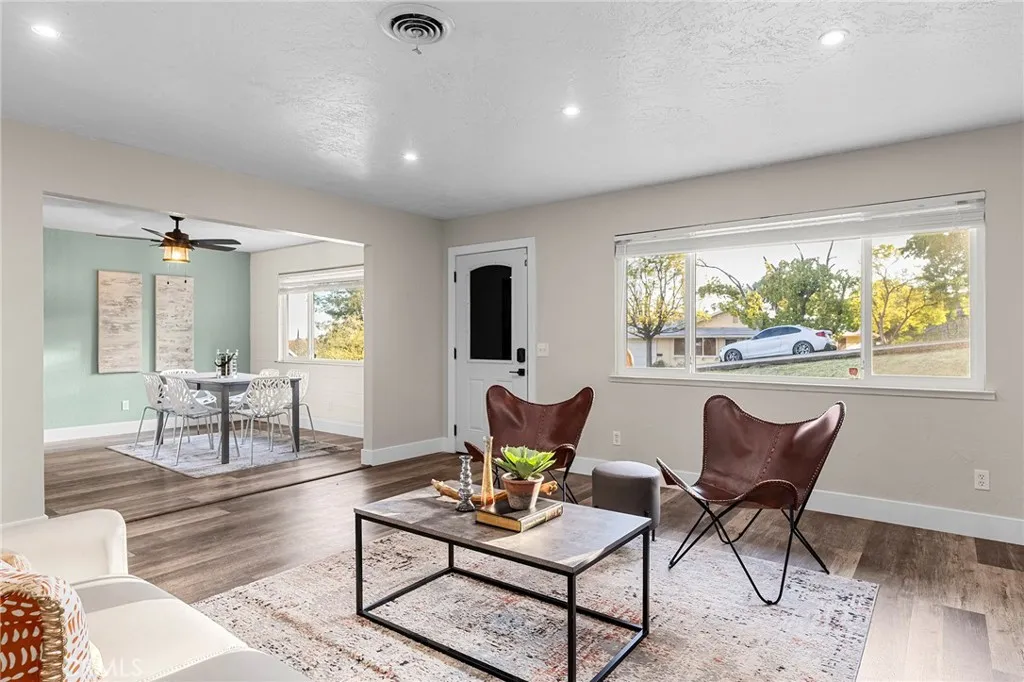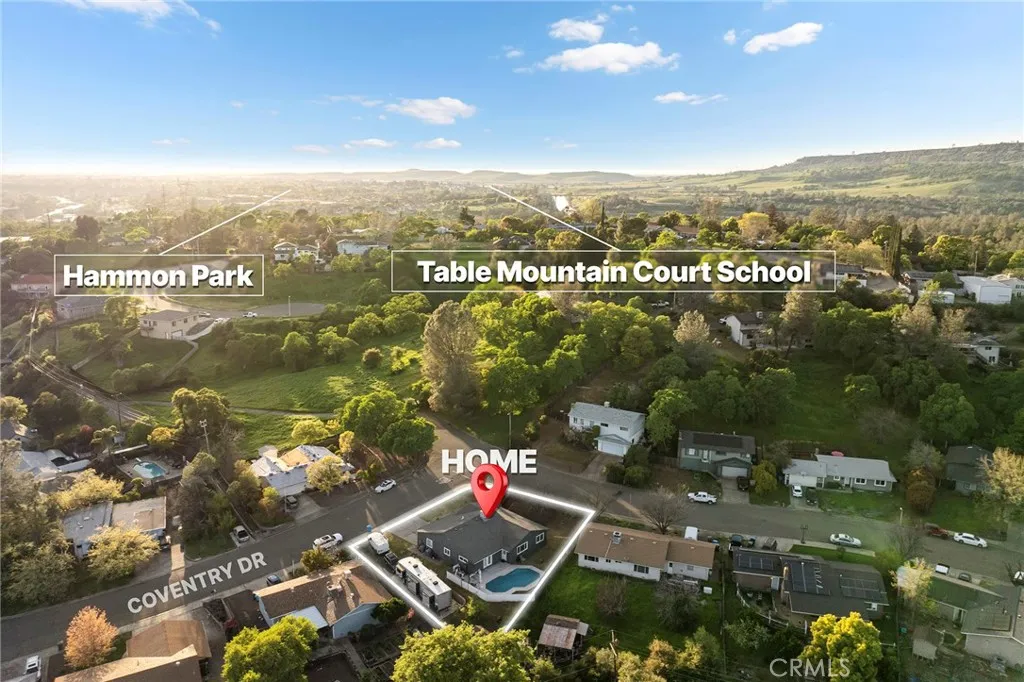 Welcome to 22 Coventry Drive, located in one of Orovilles favorite neighborhoods! Situated on a large corner lot, this home offers 3 bedrooms, 2 bathrooms, and two spacious living areas with a great floor plan designed for both comfort and functionality. The front living room is filled with natural light and features a beautiful fireplace with a rock surround. Just off the living room is a large dining area that opens to the kitchen, where youll find white cabinetry, granite countertops, stainless steel appliances, a beautiful tiled backsplash, and a stunning wood hood vent with matching floating shelves. Bar-top seating adds the perfect spot for casual dining, making this space ideal for entertaining and gathering. Toward the back of the home, youll find a desirable split floor plan with two bedrooms and a bathroom on one side, and the primary suite on the other, with the family room situated between them. The spacious primary suite features a huge walk-in closet, a private bathroom with double sinks, and French doors that lead to the backyard. Step outside to enjoy the pooljust in time for the upcoming summer monthsalong with a large yard that provides plenty of space for gardening, play, or simply relaxing outdoors. With RV parking available, theres also plenty of room for your recreational vehicles and toys. Conveniently located just minutes from the heart of town, this home is close to schools, shops, restaurants, and parks, with easy access to the scenic Lake Oroville and the Feather River for endless outdoor recreation.