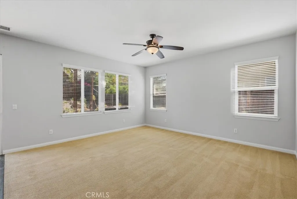 Stay cool inside and out at this Adeline's Farm oasis in French Valley. Take a dip in the pool and enjoy the indoor breeze of your whole-house fan. This Shea-built home features a custom pool with stone waterfalls, spa, and built-in poolside fire pit. Inside, dark wood floors flow through an open living area anchored by a stone fireplace with rustic wood-beam mantel. Four generous bedrooms include a spacious primary suite with wall of windows overlooking the pool, spa-inspired bath with jet tub, glass-enclosed shower, dual vanities, and enormous walk-in closet. Upstairs loft with built-in desk, plus a library or workout niche. Full laundry room with sink, direct-access 2-car garage plus separate 1-car garage for workshop or storage. Temecula School District - French Valley Elementary, Bella Vista Middle, Chaparral High. Minutes to Wine Country and Lake Skinner with community parks and trails throughout.