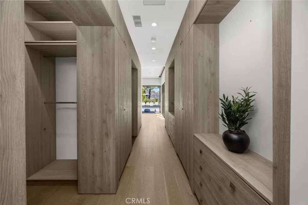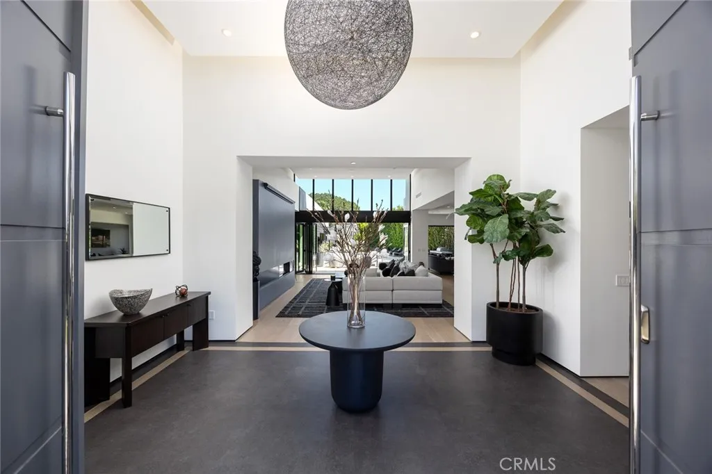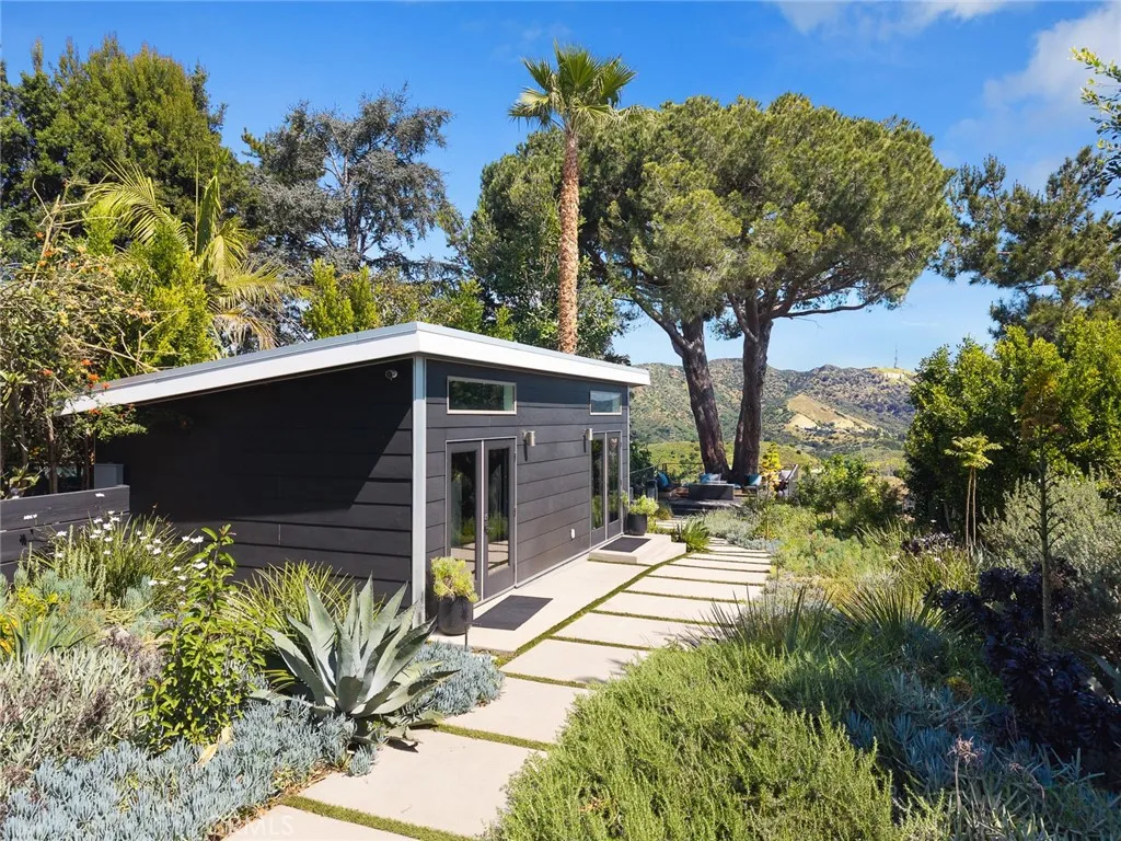 This exceptional 4-bedroom, 5-bathroom contemporary residence sits perched in the prestigious Hollywood Hills, offering sweeping views of the Griffith Observatory, the iconic Hollywood Sign, and the San Fernando Valley. At approximately 3,449 square feet on an expansive 19,164-square-foot lot, the property delivers the rare combination of generous living space and true privacy. The sophisticated single-level design showcases clean architectural lines with a striking balance of white stucco and dark accent walls. Inside, an open-concept layout is anchored by floor-to-ceiling glass walls that flood every room with natural light while framing the panoramic scenery. The living room is scaled for entertaining, with volume and sightlines that draw the eye straight to the view. The gourmet kitchen features sleek cabinetry, premium appliances, and a generous island with bar seating that flows seamlessly into the main living areas. A refined neutral palette ties the spaces together with a calm, elevated feel throughout. Multiple sliding glass doors dissolve the line between indoors and out, opening to an entertainer's backyard with distinct outdoor living zones. The expansive concrete paver patio surrounds a swimming pool with in-water loungers, while multiple seating areas, including a fire feature, offer front-row seats to stunning sunsets and city-light views. Drought-tolerant plantings, mature trees, and architectural succulents complement the home's modern aesthetic while keeping maintenance low. A detached 416-square-foot studio offers flexible space ideal for a home office, c