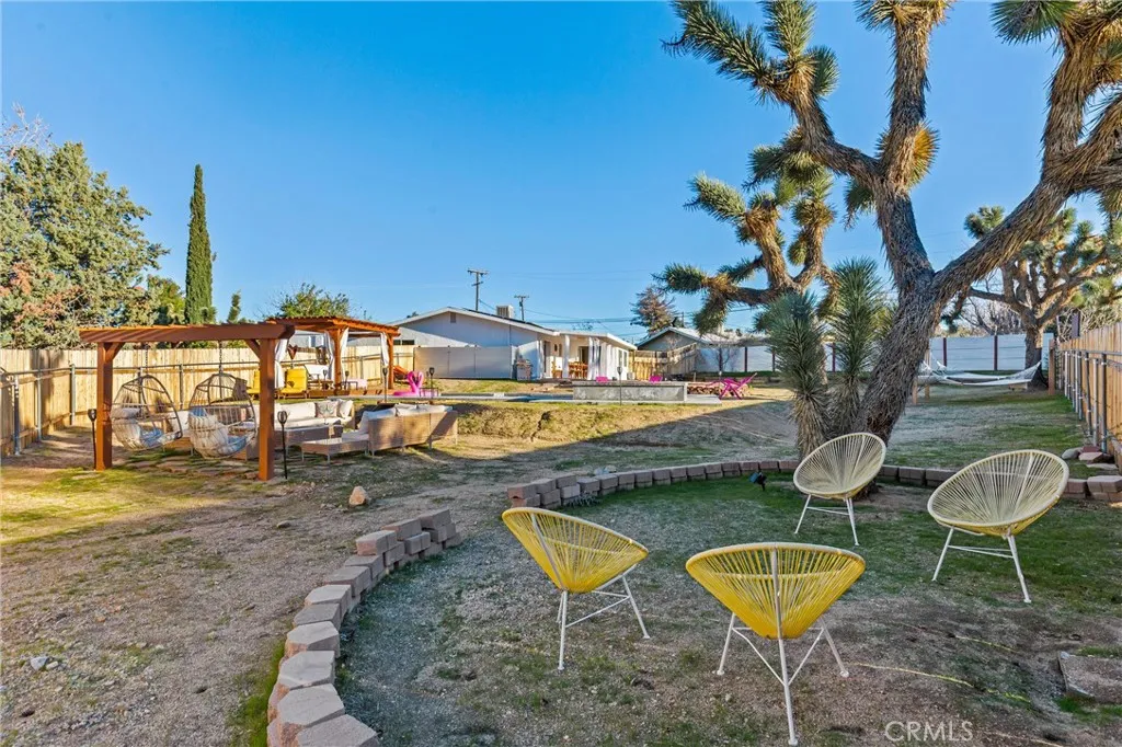Discover the perfect blend of desert charm and modern comfort in this beautifully updated three-bedroom, two-bath home situated on a generous half-acre corner lot in Yucca Valleys desirable Storey Park community. Designed with indooroutdoor living in mind, this home features an inviting open layout with abundant natural light, neutral finishes, and a seamless flow for relaxing or entertaining. The chef-friendly kitchen offers crisp white cabinetry, granite countertops, and stainless steel appliances, while the cozy living area is anchored by a classic fireplace. Step outside to your own private oasiscomplete with a sparkling 2022 pool, elevated spa, and a spacious baja shelf perfect for lounging. The backyard is fully fenced and thoughtfully designed with multiple spaces to unwind, including a covered patio ideal for dining, a wooden deck with a stylish cabana for shaded relaxation, and additional seating areas surrounded by Joshua Trees and mountain views. This layout makes it an excellent option for a primary residence, vacation retreat, or short-term rental investment (buyer to verify). Additional upgrades include owned solar (approx. 3 years old), dual-pane windows, central heating and air, a newer evaporative cooler, and a dedicated dog run. Just minutes from Joshua Tree National Park, local shops, dining, schools, and outdoor recreation, this property offers the perfect mix of tranquility, convenience, and desert-lifestyle living.