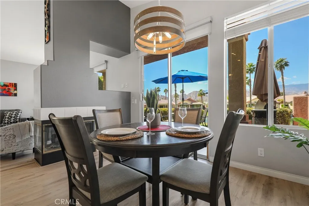 Beautifully positioned on the 4th hole within a guard-gated community, this fully furnished single-story residence offers exceptional mountain, golf course, and pond views. The home features a bright and open floor plan with large windows and sliding glass doors that provide natural light and direct access to the private patio, ideal for enjoying the surrounding scenery. The property is offered fully furnished and includes brand-new appliances throughout along with luxury vinyl flooring. The interior features 2 bedrooms and 2 bathrooms, a spacious living and dining area, high ceilings, and a three-sided fireplace. The primary suite includes an en-suite bathroom and walk-in closet. Additional features include an attached 2-car garage +golf cart garage space and a quiet cul-de-sac location. The outdoor patio overlooks the golf course and tranquil pond with panoramic mountain views beyond. Community amenities include pickleball, golf, country club, fitness center, meeting room, restaurant/bars, multiple pools and spas, greenbelts, and walking paths. Conveniently located near shopping, dining, golf, and the Indian Wells Tennis Garden.