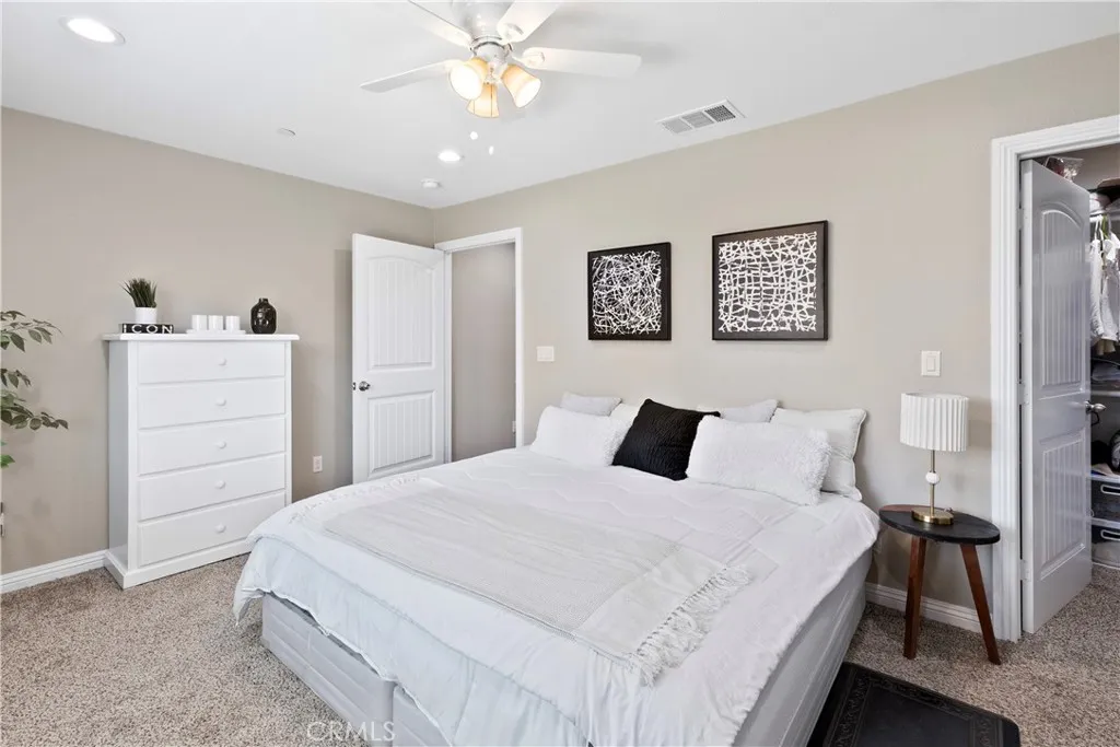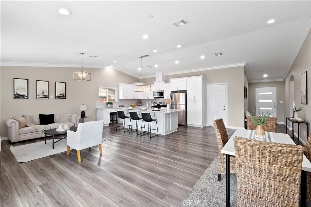 Built in 2019, this single-story Riverside home offers a functional layout with modern finishes and low-maintenance features. The home includes 4 bedrooms and 2 bathrooms, along with a 2-car attached garage, and a design that connects the main living spaces for everyday use and entertaining. The kitchen features white cabinetry, quartz countertops, stainless steel appliances, and a center island that opens directly to the living room. There is also a designated dining area along with a breakfast bar at the kitchen counter for additional seating. Vinyl flooring runs throughout the main living areas, providing durability and easy upkeep, while all bedrooms are carpeted and include ceiling fans. The primary bedroom offers a comfortable layout with carpet flooring, a walk-in closet, and an en-suite bathroom that includes a walk-in shower with tile wall surround. A separate laundry room adds convenience and keeps utility space tucked away from the main living areas. The backyard is designed for low maintenance, featuring a concrete patio area just outside the home and artificial turf in the rear yard, helping reduce water usage while still offering usable outdoor space. This home is just minutes from the 91 Freeway, with nearby shopping, dining, and access to the orange groves along Victoria Avenue. This property offers a practical combination of location, layout, and modern features. Make this great home yours today!