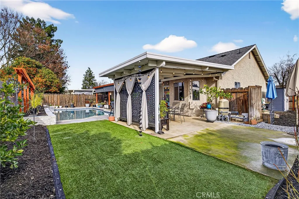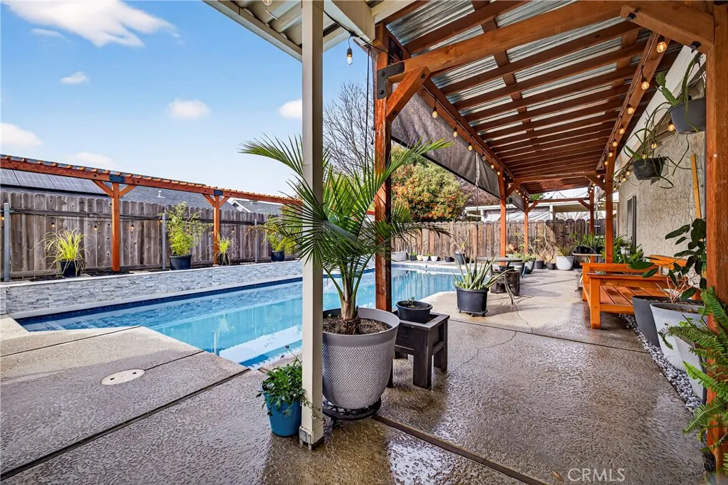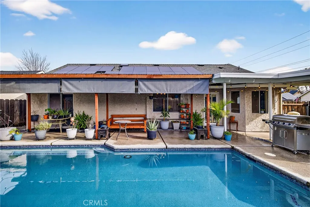 Beautifully Upgraded Home with Owned Solar and Resort-Style Backyard! This stunning home offers an owned 8.082 kW solar system with 28 micro-inverter panels, keeping energy costs low all year long. The seller has recently completed an extensive backyard renovation featuring a Pebble Tech resurfaced in-ground pool, elegant ledger stone and marble accent wall, and a stylish planter areacreating an unforgettable outdoor living space. Inside, youll find comfort and modern luxury with a new high-end Lennox central heat and air system and 2025 luxury plank flooring throughout. The upgraded kitchen showcases Cambria Quartz countertops, a beautiful tiled backsplash, Samsung stainless steel appliances, freshly painted cabinets, a deep 10" farm sink, and a cozy bay window breakfast nook. The 6-foot eating bar provides additional space for dining or entertaining. The spacious living room impresses with vaulted ceilings, recessed lighting, plantation shutters, and a new ceiling fan/light fixture. Off the kitchen, an additional living or dining area offers vaulted ceilings, a pantry closet, and glass door access to the backyard retreat. The primary suite features vaulted ceilings, a slider to the backyard, and mirrored closets. The primary bathroom includes dual sinks, a solid surface countertop, a new toilet, and a sleek step-in shower with glass doors. The guest bathroom has been upgraded with a luxurious 17" deep soaking tub, Carrara marble tile walls, glass enclosure, and a new toilet. The backyard is an entertainers dream, featuring the resurfaced Pebble Tech pool, granite and marb