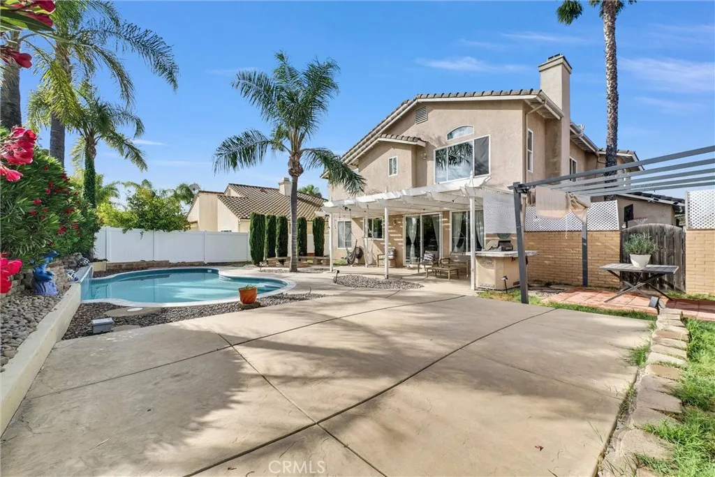 Welcome to this beautifully upgraded 5-bedroom, 3.5-bath home with paid solar, offering a rare combination of space, efficiency, and resort-style living in Murrieta. Step inside to soaring ceilings, abundant natural light, and a layout designed for both everyday living and effortless entertaining. The remodeled kitchen is a standout, featuring modern finishes, custom 40 cabinetry with exceptional storage, a large pantry, and a built-in wine fridgeopening seamlessly to the main living areas. Upstairs, the spacious primary suite offers his-and-hers walk-in closets with custom built-ins and a well-appointed ensuite bath. The additional bedrooms are generously sized and thoughtfully positioned, providing comfort and privacy throughout. A dedicated laundry room adds everyday convenience. Step outside to your private backyard retreat, complete with a sparkling pool, waterfall feature + solar heated pool plus electrical already in place for a future spa or jacuzzi. Additional highlights include an EV-ready garage, no HOA, and energy-efficient living with approximately $600/year electricity costs. Conveniently located near top-rated schools, shopping, dining, and major commuter routes. Turnkey, energy-efficient, and move-in ready.