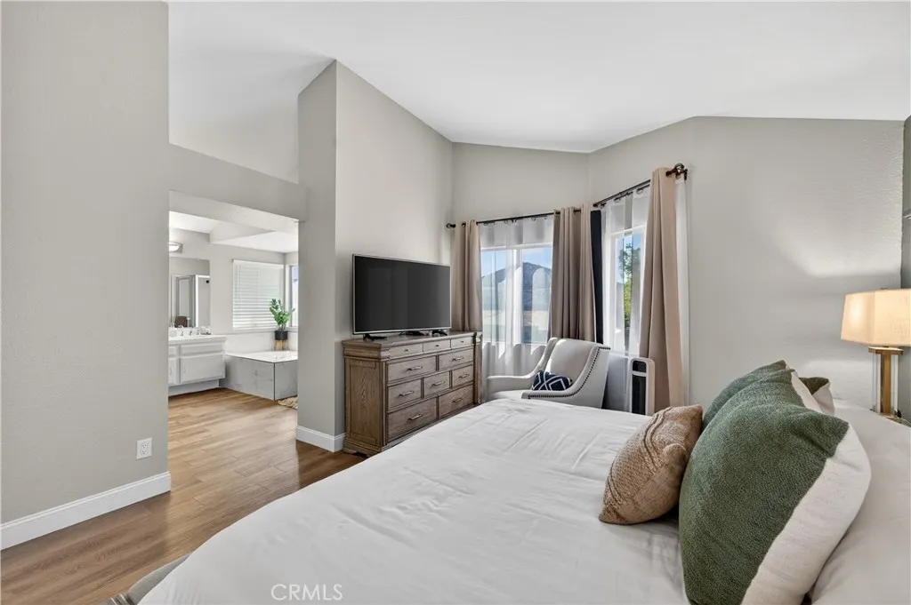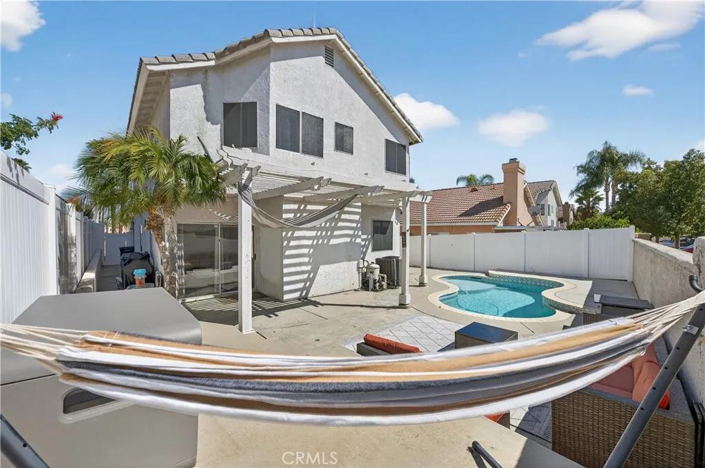 Come see this POOL home in Menifee Lakes community! The home features spacious 4 bedrooms and 3 bathrooms. First floor bedroom makes great office or guest room. Kitchen features a pantry and plenty of cabinet space. Whether you want privacy in your own backyard pool, or to socialize at the community beach club pool, the heat doesn't stand a chance! Menifee Lakes offers many amenities such as golf, private beach club, and a 35 acre lake with fish. Home is located minutes away from freeway and shopping center.
