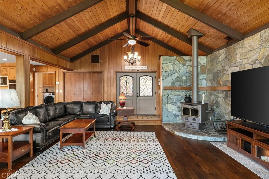 Enjoy stunning lake views in this rare geman exceptional ABC Cedar CUSTOM built home offering character and craftsmanship. Showcasing exceptional detail, this property features custom woodwork throughout and a striking stone fireplace that anchors the living space with warmth and charm. Thoughtfully paired with modern comforts, the home offers fully owned solar, newer HVAC, roof, windows, and updated appliances. Over the years, the seller has carefully enhanced the home with updated flooring, fresh paint, and morealways preserving its original charm and timeless appeal. The main level welcomes you with an immediate sense of space and light. As you enter, you're greeted by a spacious living room with breathtaking lake views that continue seamlessly through the kitchen, dining area, and primary suite. The kitchen has been tastefully updated with newer cabinetry, countertops, and upgraded appliances, offering both style and functionality. A custom laundry room adds convenience with a full wall of pantry storage and additional counter space. The primary suite is beautifully updated, featuring a step-in shower, double vanity, and a generous walk-in closet. Downstairs, the home lives like a second residencecomplete with additional bedrooms, a full bathroom, living room, second laundry area, and an expansive media room featuring a kitchenette and projection theater with big screen. This setup is ideal for multi-generational living or hosting guests with ease. Step outside to an expansive back deck designed to take full advantage of the stunning lake views and sunshineperfect for r