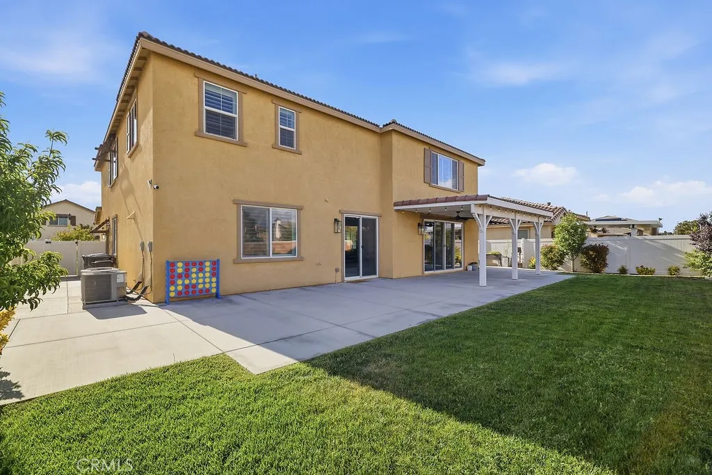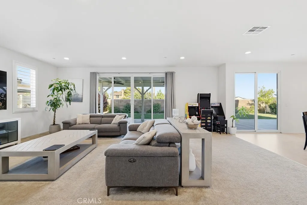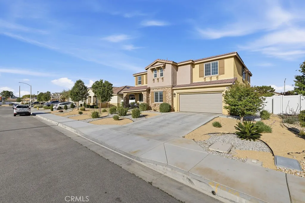 Welcome to this stunning, like new home built in 2021, ideally located in a quiet West Palmdale cul-de-sac. This spacious 5-bedroom, 4-bathroom home offers the perfect blend of comfort, functionality, and modern design. From the moment you arrive, you're greeted by a charming front porch--perfect for enjoying your morning coffee. Inside, the home is filled with natural light, complemented by large windows and shutters throughout. The open-concept layout features a spacious family room that flows seamlessly into the dining area and kitchen, making it ideal for everyday living and entertaining. The kitchen is designed for gatherings, offering a large breakfast bar, space for a dining table, stainless steel appliances, and a generous walk-in pantry with direct access to the 3car tandem garage--perfect for easy grocery unloading. Sliding glass doors provide convenient access to the backyard for indoor-outdoor living. A desirable downstairs bedroom and full bathroom offer flexibility for guests or multi-generational living. Upstairs, you'll find a spacious loft with a balcony overlooking the family room, along with generously sized secondary bedrooms. A Jack-and-Jill bathroom with dual sinks adds convenience, while the primary suite serves as a true retreat with space for a sitting area. The primary bathroom features separate sinks, a standalone soaking tub, and a separate shower. The upstairs laundry room adds to the home's functionality. Enjoy energy efficiency and long-term savings with fully paid-off solar panels--no lease or loan to assume. The front yard showcases beautifu