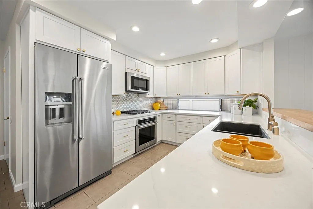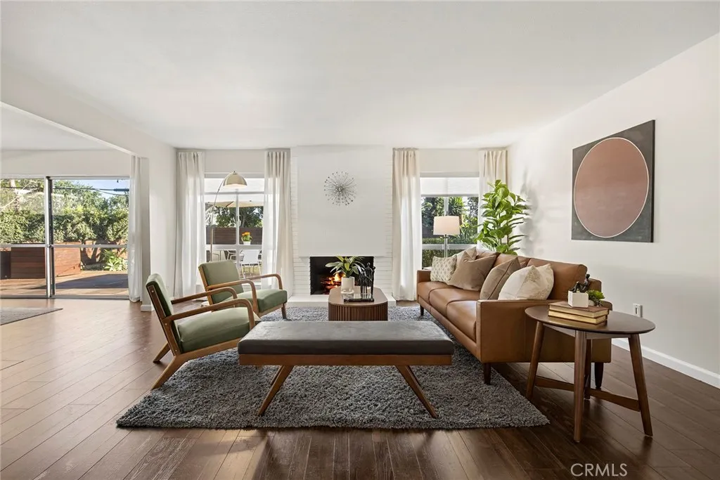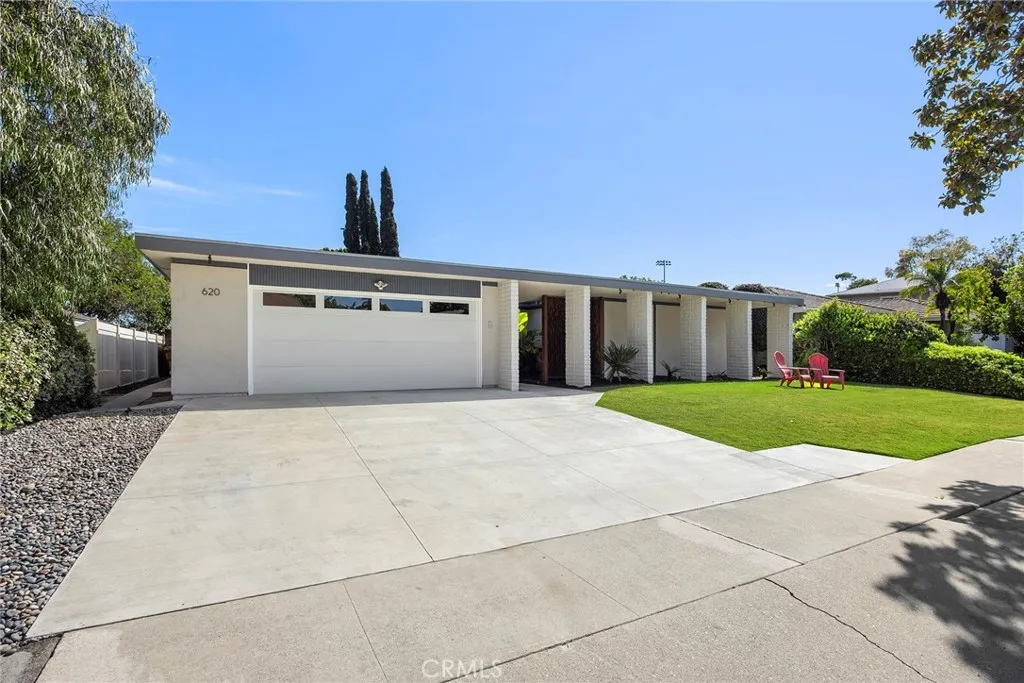 Stylish, striking and exuding an understated cool vibe, this stunning mid-century modern residence is sure to impress, welcome to 620 E. Glenwood Avenue. Tucked into a quiet, tree lined cul-de-sac; crisp, sharp architectural details are complimented by a lush, tropical landscaped entryway. Double doors lead into a spacious, meticulous and FRESHLY PAINTED interior with wood flooring throughout the living areas and main hallway. The striking fireplace is balanced by two large windows overlooking the manicured backyard, the spacious living room flows perfectly into the formal dining room with stylish chandelier and a sliding door to the backyard and patio. A remodeled and perfectly appointed kitchen features quartz counters with a contrasting wood breakfast bar, a full suite of KitchenAid SS appliances including a 5-burner gas cooktop, side-by-side fridge and quality shaker white cabinetry. A breakfast nook, guest bathroom and direct garage access complete this side of the home. Down the light filled hallway with skylight, double doors lead into a surprisingly spacious primary suite with dual closets, one a walk in, and a sliding door to the backyard. The en-suite has been remodeled with a perfect mid-century modern style featuring custom tile flooring and shower enclosure and a beautiful dual sink vanity. Three secondary bedrooms with new carpet and an updated full bathroom are found as you continue down the hallway. The private and stylish backyard enjoys a wood slat patio and great horizontal fencing detail. Owned, fully paid off 3.6 Kw SOLAR system too. 7 year old membran