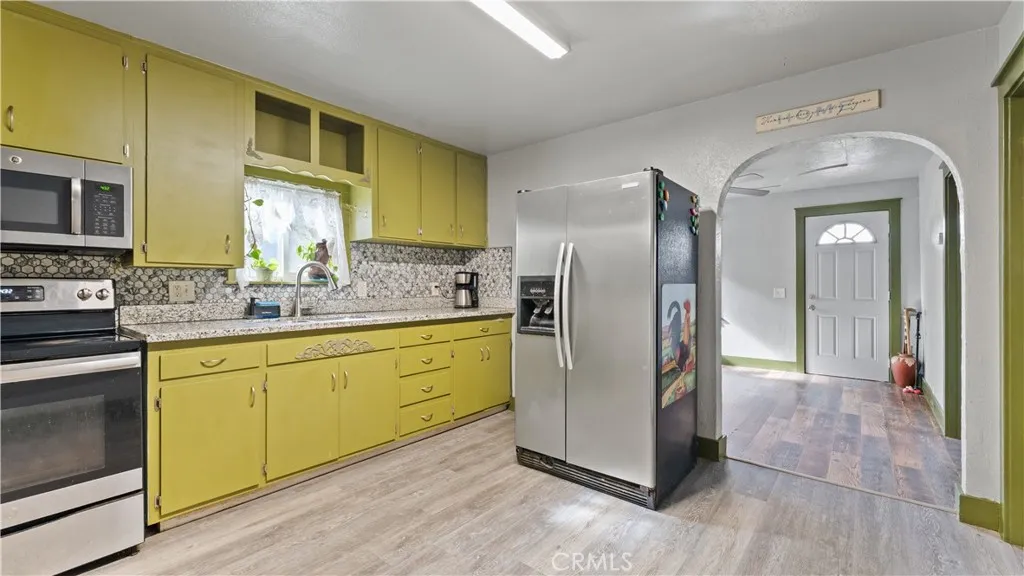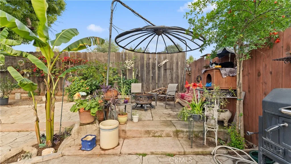 Custom concrete walkways, patios, and retaining walls welcome you as you enter the fenced and gated front yard. Flowers and multiple fruit trees (lemon, kumquat, lima dulce, pomegranate, avocado and peach trees) greet you with fragrant blossoms. Step from the covered porch to a cozy living room that awaits relaxing evenings. The two bedrooms are perfect for single, a couple or a small family. The kitchen is equipped with all of the necessary amenities (refrigerator, electric range, and microwave hood). The laundry closet/pantry is conveniently located just off the kitchen, with the washer and dryer included. Step out of the back door to another custom-built deck that is surrounded by more custom concrete work. A covered sitting area and outdoor kitchen are perfect for entertaining and family barbecues. The home has undergone some upgrades in recent years, a new roof within 7 years, new floors within 5 years, and various other improvements. A storage shed is located in the back, and a small garage/shop is adjacent to the home.