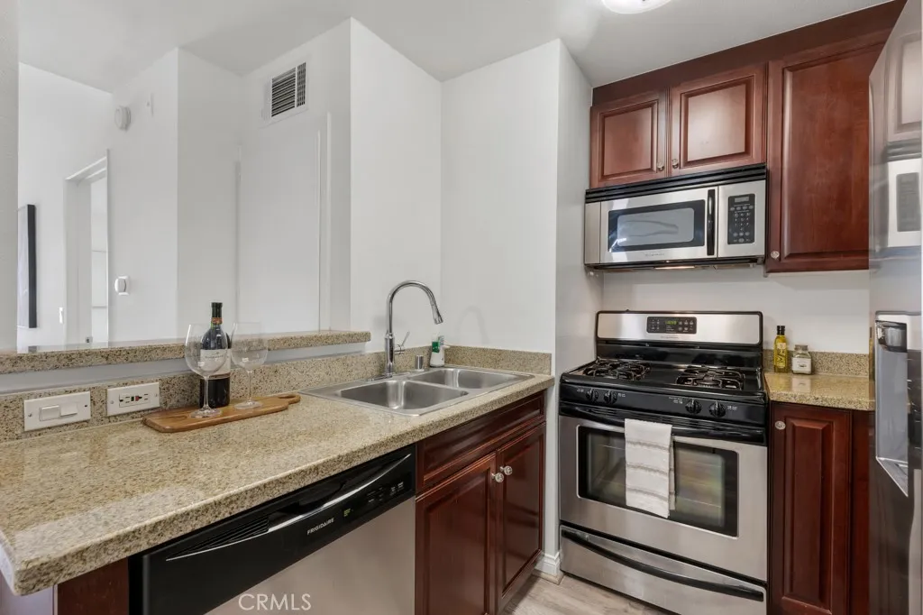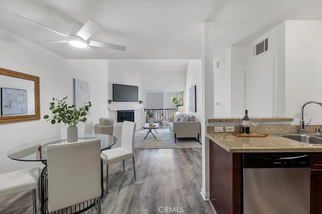 Welcome to this stunning 3rd floor corner unit at the highly sought-after MET community in Woodland Hills. This stunning unit features soaring vaulted ceilings, clean crisp architectural lines, and an abundance of natural light. Spanning approximately 610 sq ft, this thoughtfully designed 1-bedroom, 1-bathroom condo lives larger than its footprint thanks to an open-concept layout that seamlessly connects the living, dining, and kitchen areas. The well-appointed kitchen features rich cherry wood cabinetry, granite countertops, and a full suite of stainless steel appliances including a gas range and French door refrigerator perfect for everyday cooking and entertaining. The inviting living room centers around a cozy fireplace and opens via sliding glass doors to a private balcony with peaceful treetop and courtyard views, ideal for morning coffee or winding down in the evening. The generously sized primary bedroom offers hardwood-style flooring, a ceiling fan, and a large window framing lush greenery, complemented by an en-suite bath with granite vanity and tub/shower combo. Adding exceptional value, this unit comes with a rare 3 dedicated parking spaces, a truly standout feature in any HOA community. Residents of the gated MET enjoy resort-style amenities including a pool, spa and a fitness center, all just moments from Ventura Boulevard's dining and shopping, Warner Center, and easy 101 freeway access.