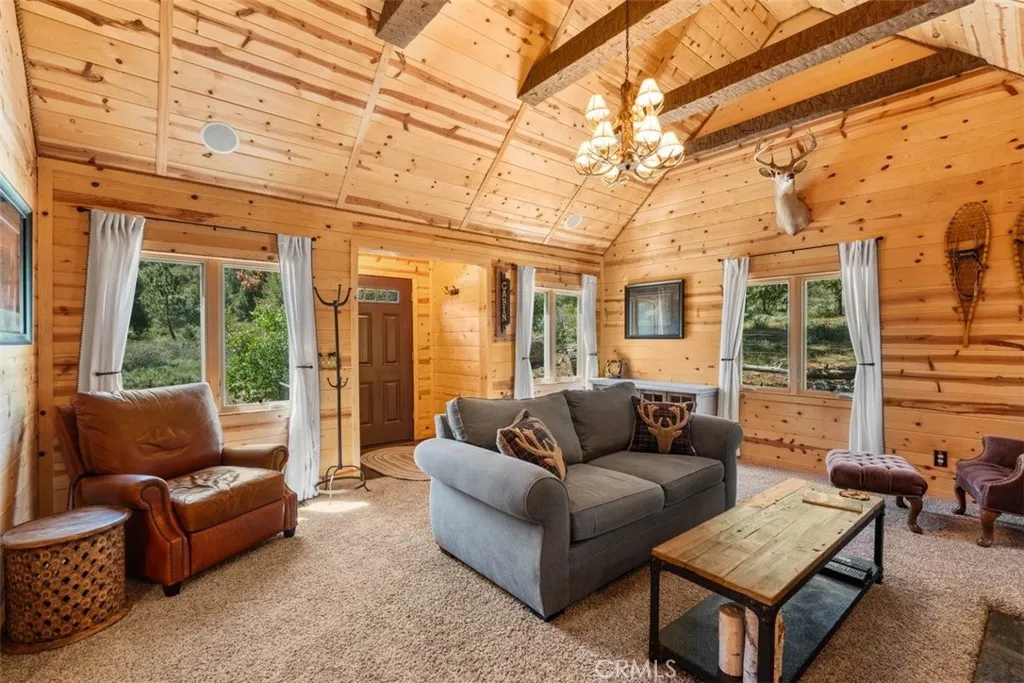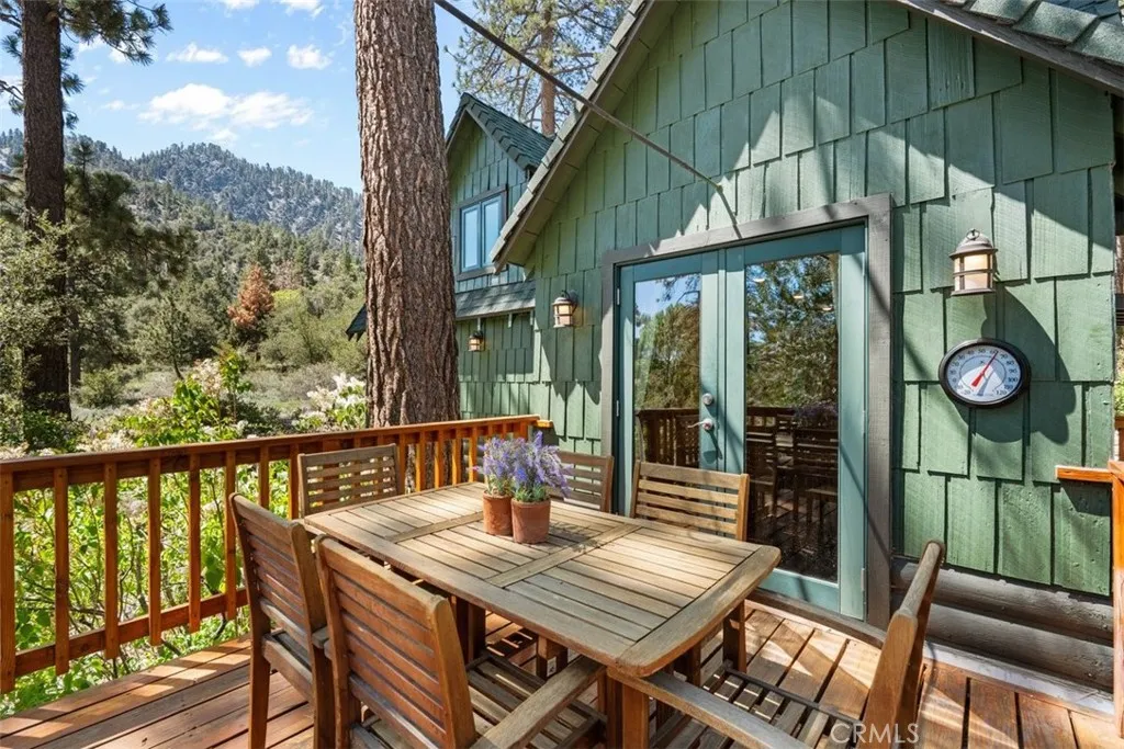 Charming Wrightwood Cabin! Home features 2 bedrooms with a loft or third bedroom/office and 1 full bath. This home is turnkey with pride of ownership inside and out! Enjoy panoramic, unobstructed mountain views from the comfort of your home. Living room has beautiful Cathedral pine ceilings with wood beams, native rock gas fireplace, built-in speakers in the living room for entertaining. Upstairs with integrated interior stair lighting for step illumination to your one bedroom and a loft with a view of the mountains. So Nice! This property had a top-to-bottom transformation in 2017, including new roof, energy-efficient windows, doors, floors, electrical, plumbing, central air conditioner and central heater, tankless water heater, water softener, cabinets, granite countertops, and cozy pine wood on all ceilings and walls. More recent upgrades include a new septic system, garage door, and rebuilt decks. Additional features include a deep garage, automated exterior lighting, and an automatic irrigation system in the yard. This home is Fully Furnished, including all appliances, furniture, dishes, and other decor. This home is a must see!! You will love it!