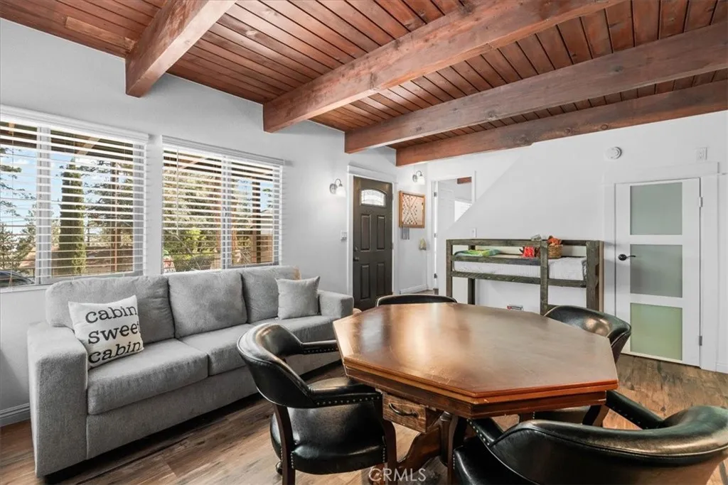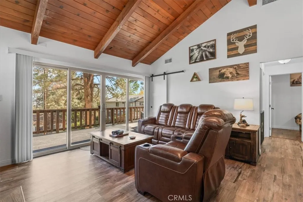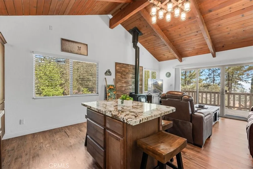 Sitting high above the clouds in picturesque Wrightwood, welcome to 5243 Desert View Dr.! Bring the RV and toys and that's about it, as this fully furnished home has everything you'll need to enjoy a getaway or investment in the Eastern an Gabriel Mountains. Offering three bedrooms and two bathrooms, this cabin is the perfect example of Mountain meets modern. Completely remodeled and taken down the studs in 2020, this majestic Mountain property blends designer granite finishes and vinyl dual pane windows, vinyl plank laminate and wood like tile flooring, stainless appliances with traditional features like knotty pine tongue and groove ceilings, open beam effects and an awesome free-standing wood burning stove that's not only beautiful but super productive. Two well appointed bedrooms and a full bathroom on the main floor, along with a large slider to your rear deck and balcony which overlook the Desert floor and your large backyard. Downstairs, the Primary Suite is your zen zone, with walk in shower that features a gorgeous tile overlay. The downstairs area also sports your family room/game room equipped with bar and access to the rear yard, more storage and nifty laundry closet. Outside, paramount views to the South from the front deck and peek a boo views to the North from your rear patio give perspective on how special this Desert View area is! New concrete driveway and stairs, room to park 6 plus cars, any size RV or Fifth wheel and still have room to play in the snow or develop your own fruit or veggie garden give the best of all worlds! Other amenities include A/C, wa
